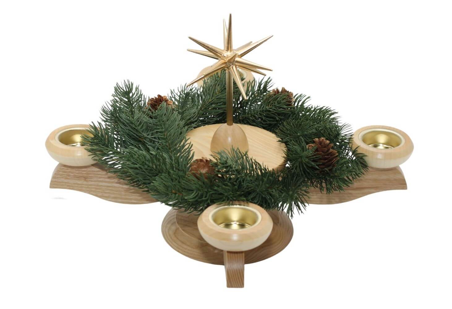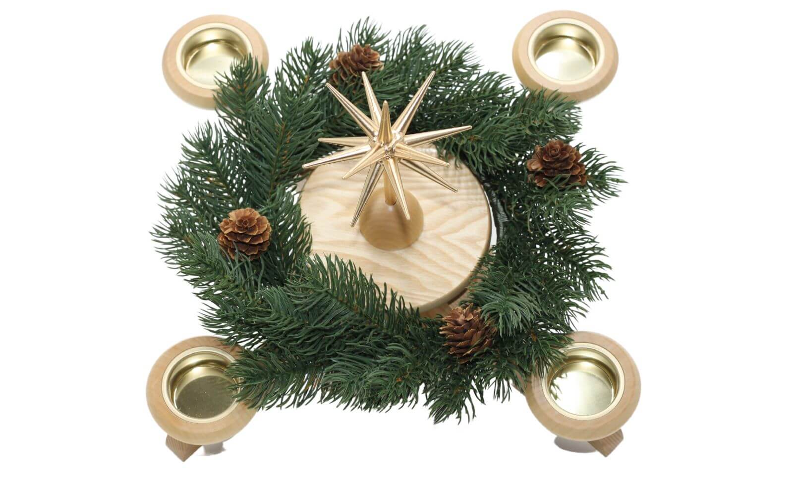 Advent candlestick, natural with poinsettia, a fir wreath made of plastic and natural - colored plateau of Albin Preißler from Seiffen in the Ore Mountains