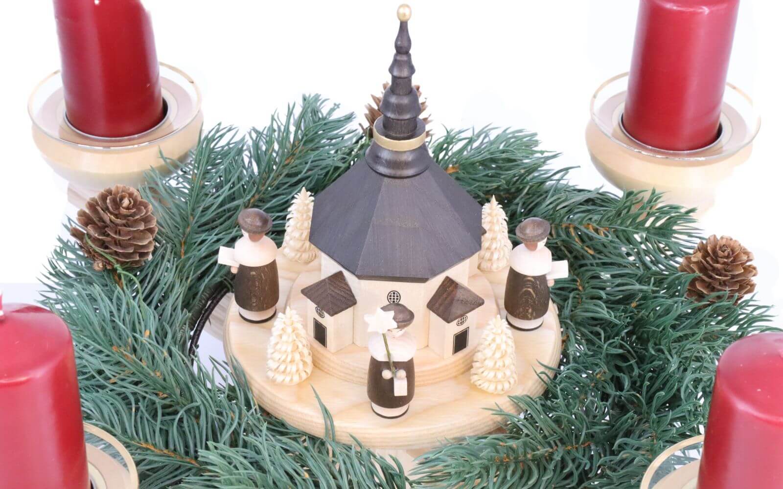 Advent chandelier with Seiffen church, Kurrende and a fir wreath made of plastic, nature of Albin Preißler from Seiffen in the Ore Mountains