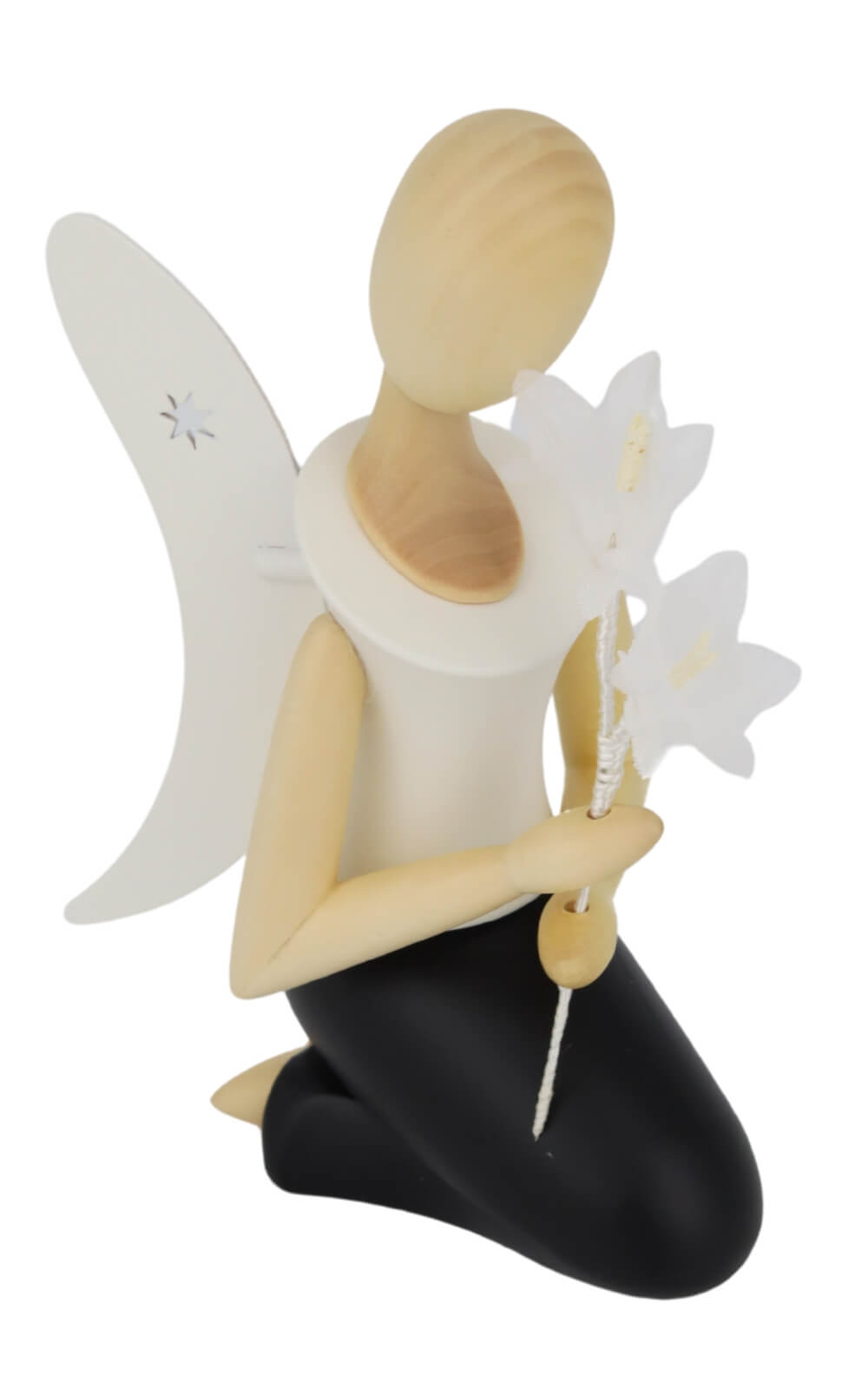 Anyone who appreciates the fine and traditional craftsmanship of the Erzgebirge will be delighted by this extraordinary angel figurine. The angel - star head with bellflower, kneeling, 25 cm from Holzkunst Gahlenz combines modern design with classic Erzgebirge tradition - making it a unique eye-catcher for any stylish decoration, not just at Christmas time. Year-round decoration and lovingly handcrafted from the Ore Mountains The figurine shows a kneeling angel with simple elegance, holding a delicate bellflower in his hands. This symbolic gesture stands for peace, purity and hope - values that have a special meaning not only at Christmas time. The characteristic star-shaped head is particularly striking and gives the angel a modern yet timeless look. The stylized shape of the face, without any painted details, leaves room for interpretation and brings the angel's gentle posture into focus.