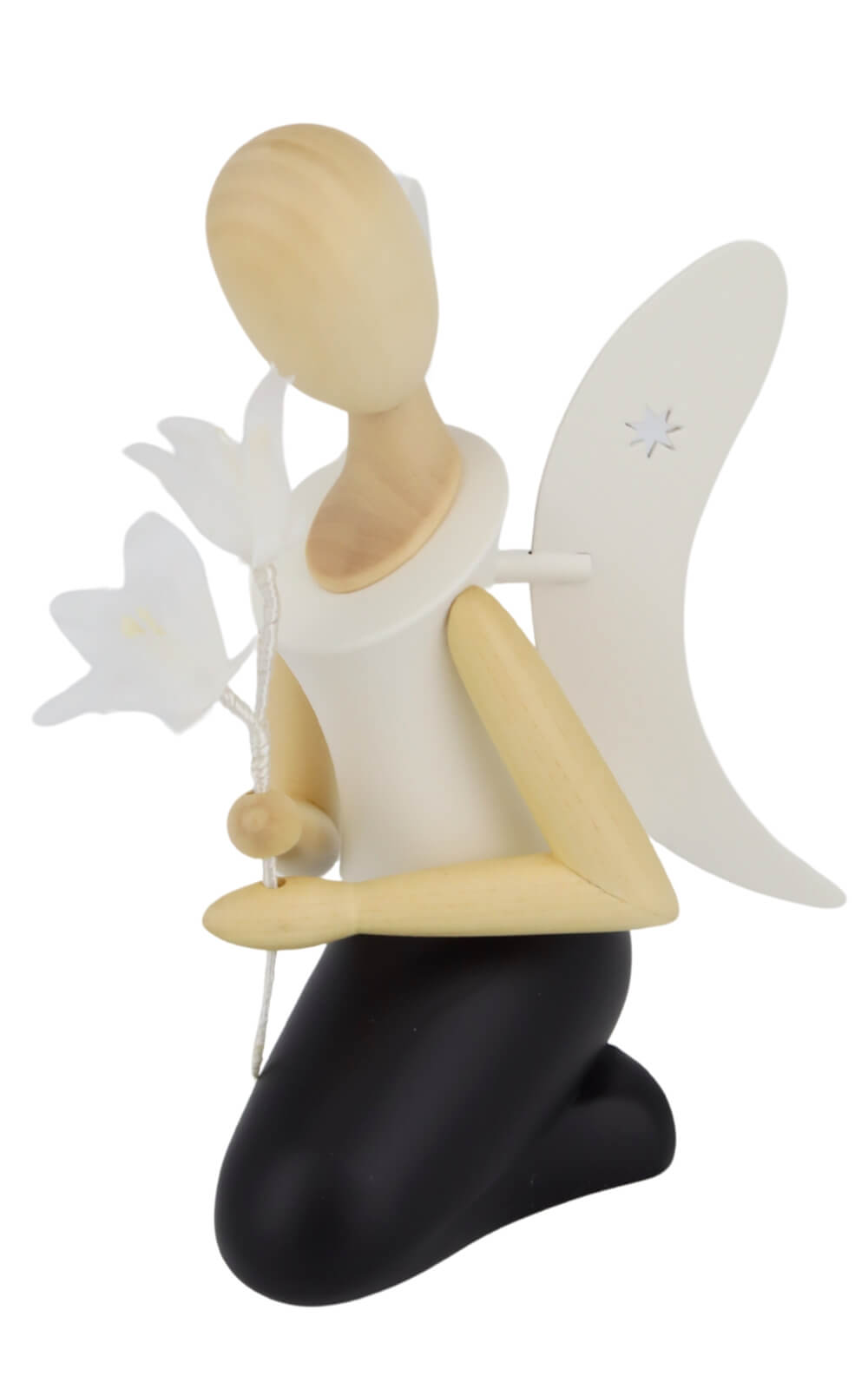 The angel - Sternkopf with bellflower, kneeling, 25 cm from Holzkunst Gahlenz is made from local woods such as maple, beech, ash, lime or spruce. Each piece is carefully handcrafted in Gahlenz in the Ore Mountains and bears the “Made in Germany” seal. The combination of light natural wood and subtle color accents in white and black underlines the simple elegance of the figurine and makes it a high-quality decorative object for your home.