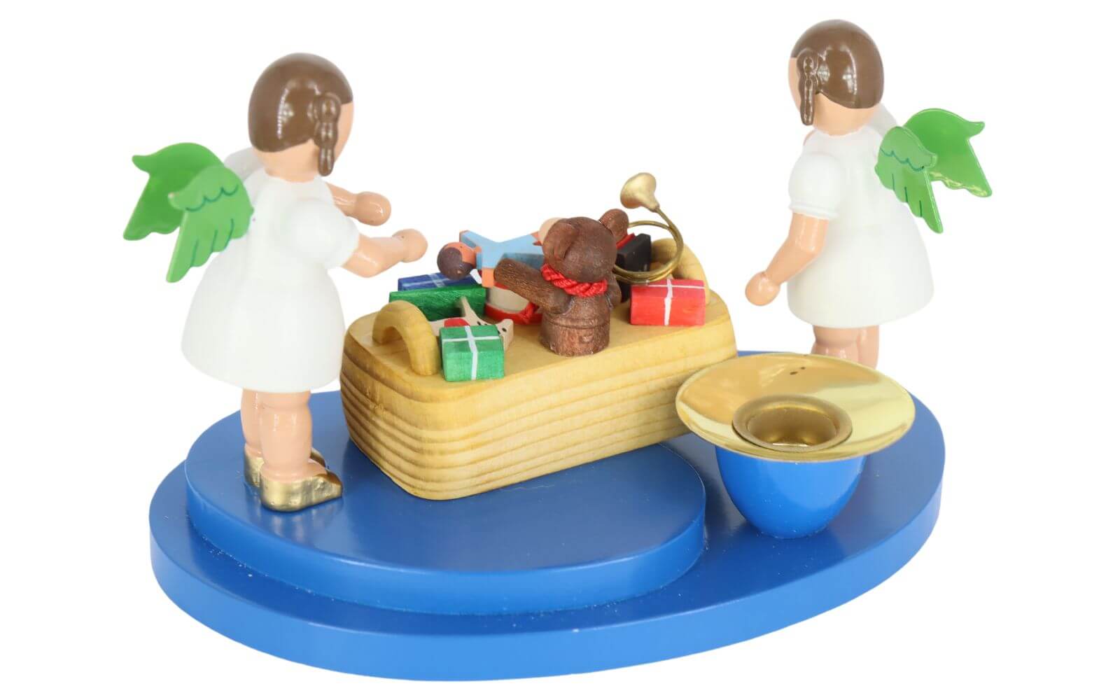 Angels are inextricably linked with Christmas, which is why many Erzgebirge artists have included them in their range. Richard Glässer angels are characterized by their charming form. White dresses, golden shoes and green wings are their trademark. Here you will receive two lovingly crafted Christmas angels. The blue base is reminiscent of a cloud. The two angels stand on it, curiously looking at the toy basket. Various toys are waiting in the basket to bring joy to the little angels. Little bears, various instruments, a little doll and wrapped surprises invite them to play.