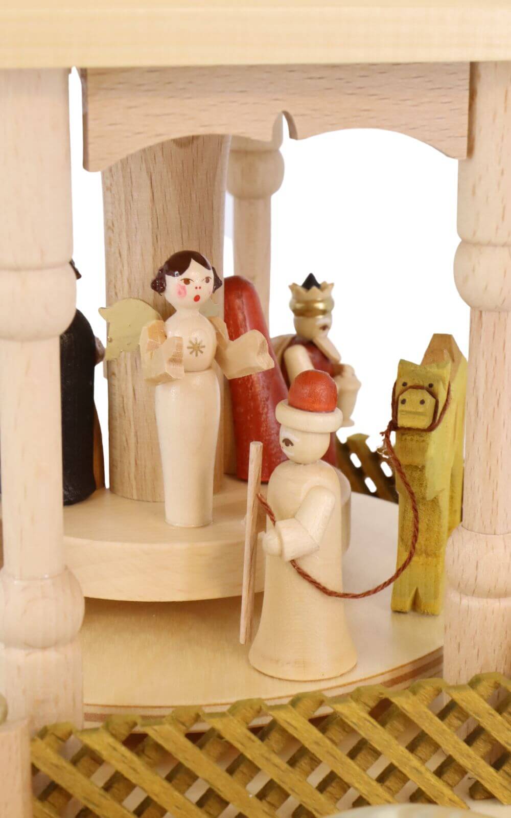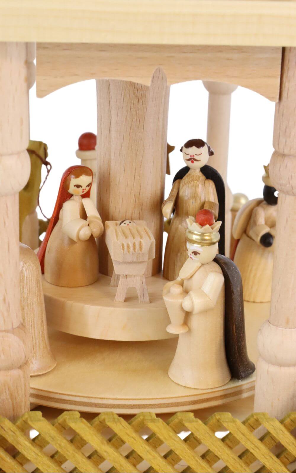 On three floors, the Christmas pyramid tells the story of the Holy Family. The lowest level presents the birth of Jesus Christ with the Magi, Balthasar, Kaspar and Melchior and their gifts for the Christ Child. In the center you will be able to admire the Holy Family with Mary, Joseph and the baby Jesus in the manger. The second floor is populated by two shepherds and cute sheep, who follow the star to Bethlehem, while on the third level angels with trumpets spread the good news.