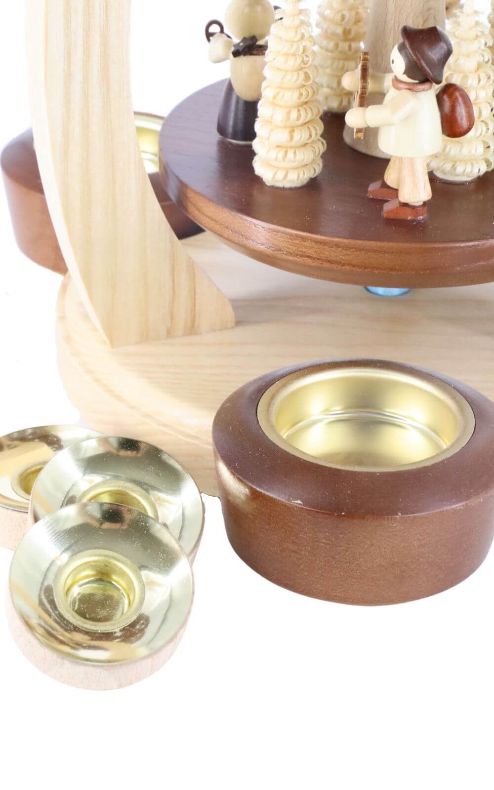 With its stately size of 28 cm in height and 24 cm in width and length, the Christmas pyramid dealer fits harmoniously into any Christmas decoration. Its illumination is provided by three pyramid tea lights, which spread a pleasant,warm light and provide a cozy atmosphere.
