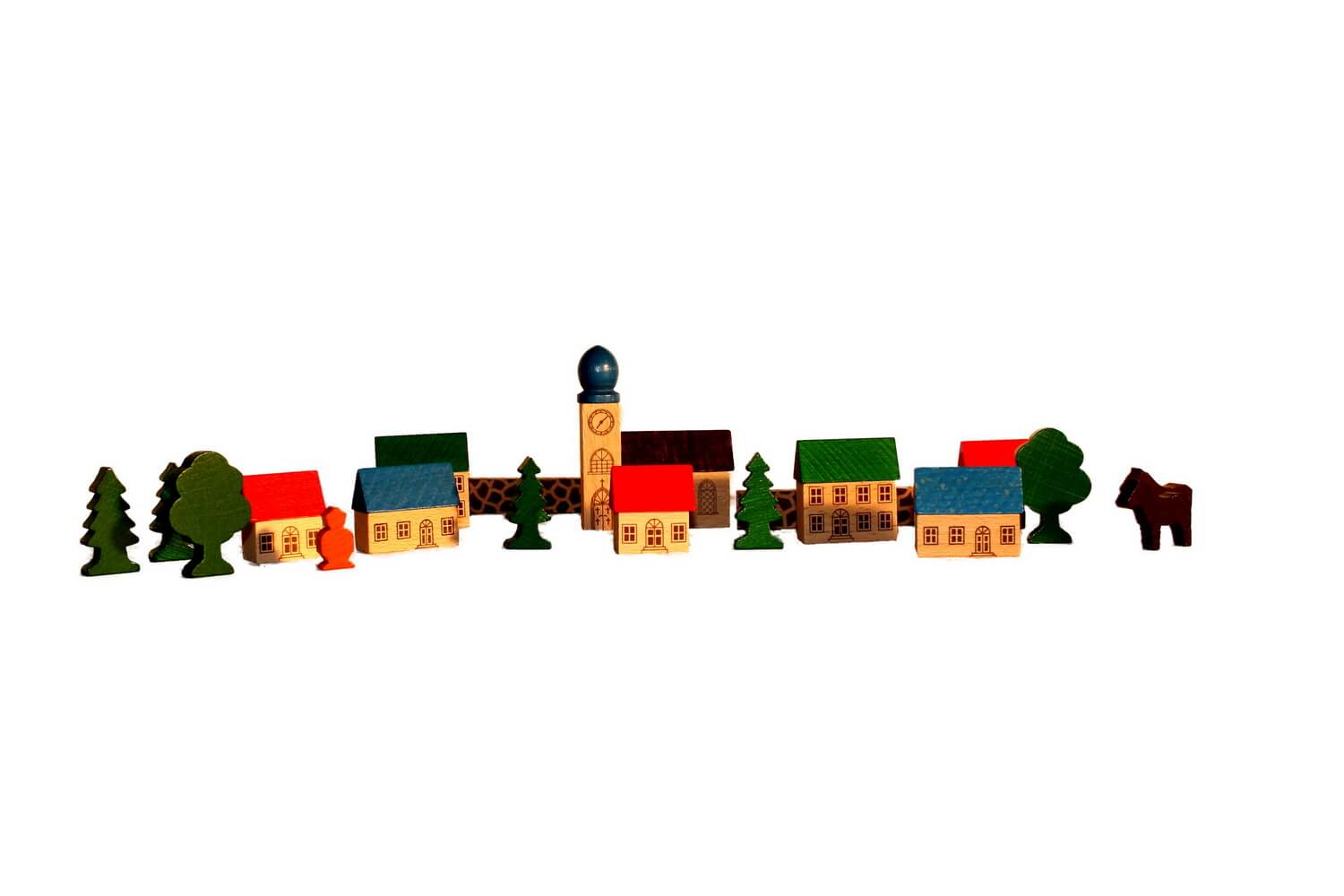 Ganz idyllisch, im Land der Kreavität und Phantasie, liegt dieses kleine Bergdorf. Kennzeichnend sind die typischen roten Dächer und der klassische Kirchturm mit seiner tollen blauen Kirchturmspitze. Ein Spielspass für Klein und Groß. Durch die Miniaturteile wird spielerisch die Hand- Augen - Koordination trainiert und die Feinmotorik geschult.