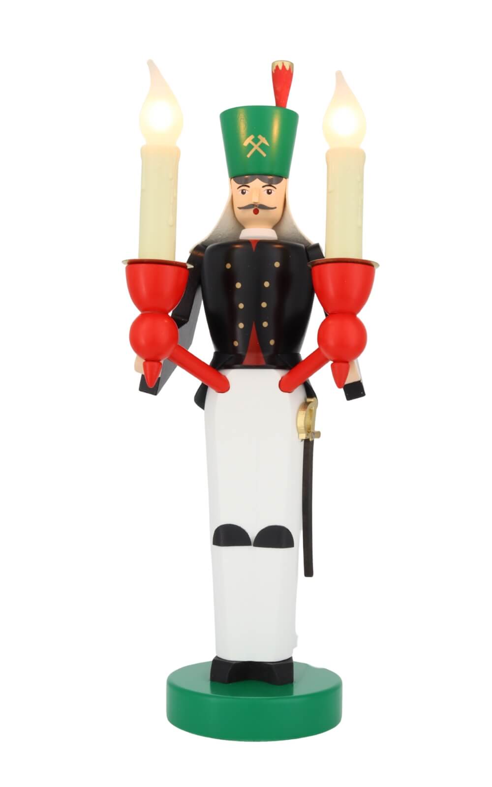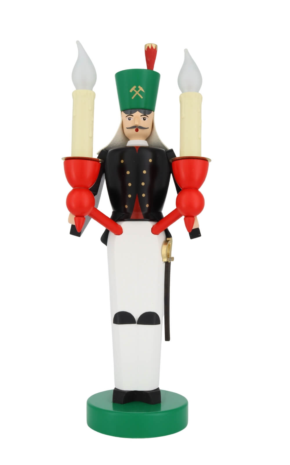 Das Bild zeigt den Bergmann in seiner typischen Tracht: Er trägt eine schwarze Jacke mit goldfarbenen Knöpfen, eine weiße Hose und eine grüne Bergmannsmütze, die mit gekreuzten Schlägel und Eisen verziert ist – das traditionelle Bergmannssymbol. In beiden Händen hält er rote Leuchterarme, die mit elektrischen Flammenkerzen bestückt sind. Diese beiden Kerzen strahlen warmes Licht aus und erinnern an die jahrhundertealte Tradition, Licht in die dunkle Jahreszeit zu bringen.
