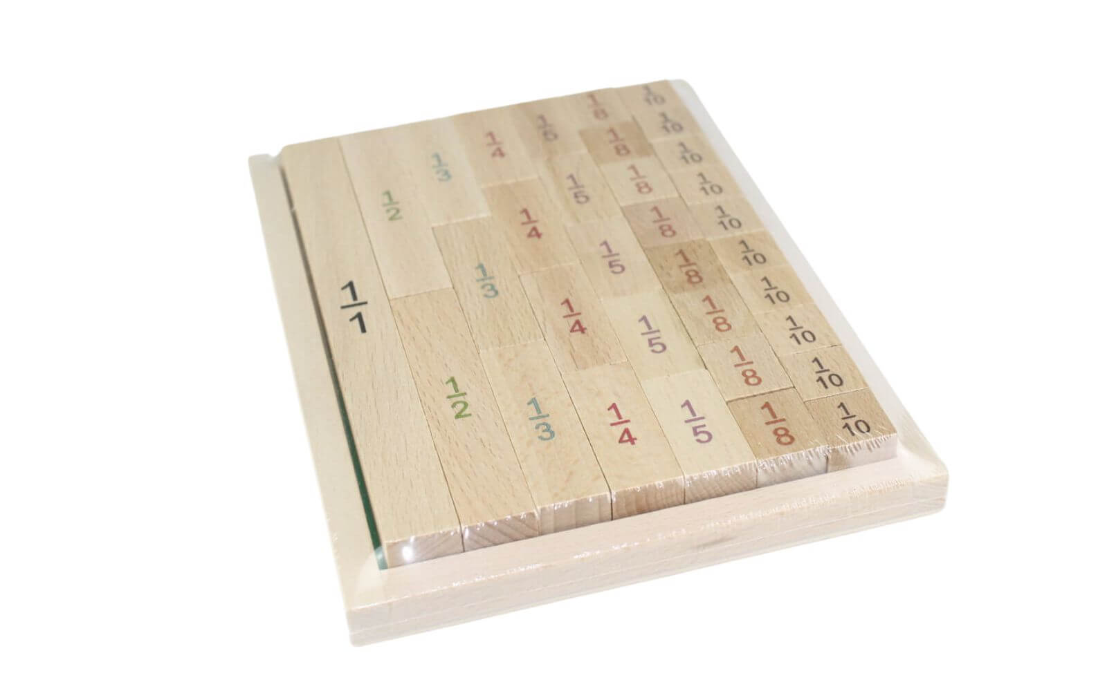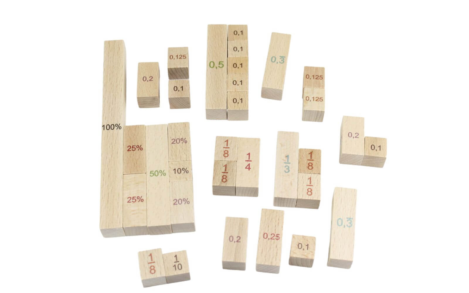 Das Set besteht aus 33 Klötzchen, die auf einem Tableau angeordnet werden können. Diese Klötzchen bieten eine visuelle und haptische Methode, um Brüche und Prozente zu lernen und zu verinnerlichen. Jedes Klötzchen zeigt eine andere Teilung, was es den Kindern ermöglicht, die mathematischen Beziehungen besser zu verstehen und zu begreifen. Die klare Darstellung von Bruch, Dezimalbruch und Prozentsatz auf jedem Klötzchen unterstützt das Lernen und hilft, mathematische Konzepte leichter zu erfassen.