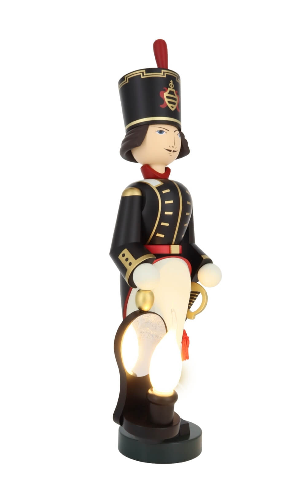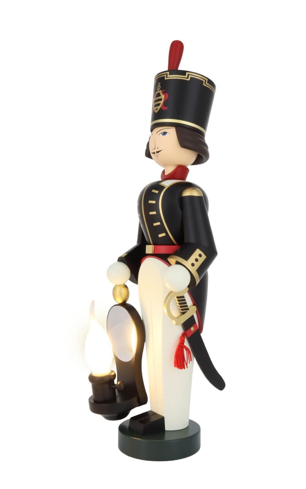 Beide Figuren wirken durch ihre aufrechte Haltung und harmonische Gestaltung besonders präsent. Der Engel in strahlendem Weiß trägt weiß-goldene Flügel und ein langes Gewand mit feinem Gold als Verzierung. In seinen Händen hält er eine stilisierte Kerzenleuchte, die in weichem Licht erstrahlt. Der Bergmann in klassischer Uniform in Schwarz, Gold und Weiß trägt eine Grubenlampe und typischem Schachthut mit rotem Federbusch. An der Seite trägt er einen Säbel, was seine Funktion als Schutzherr der Familie symbolisieren soll.