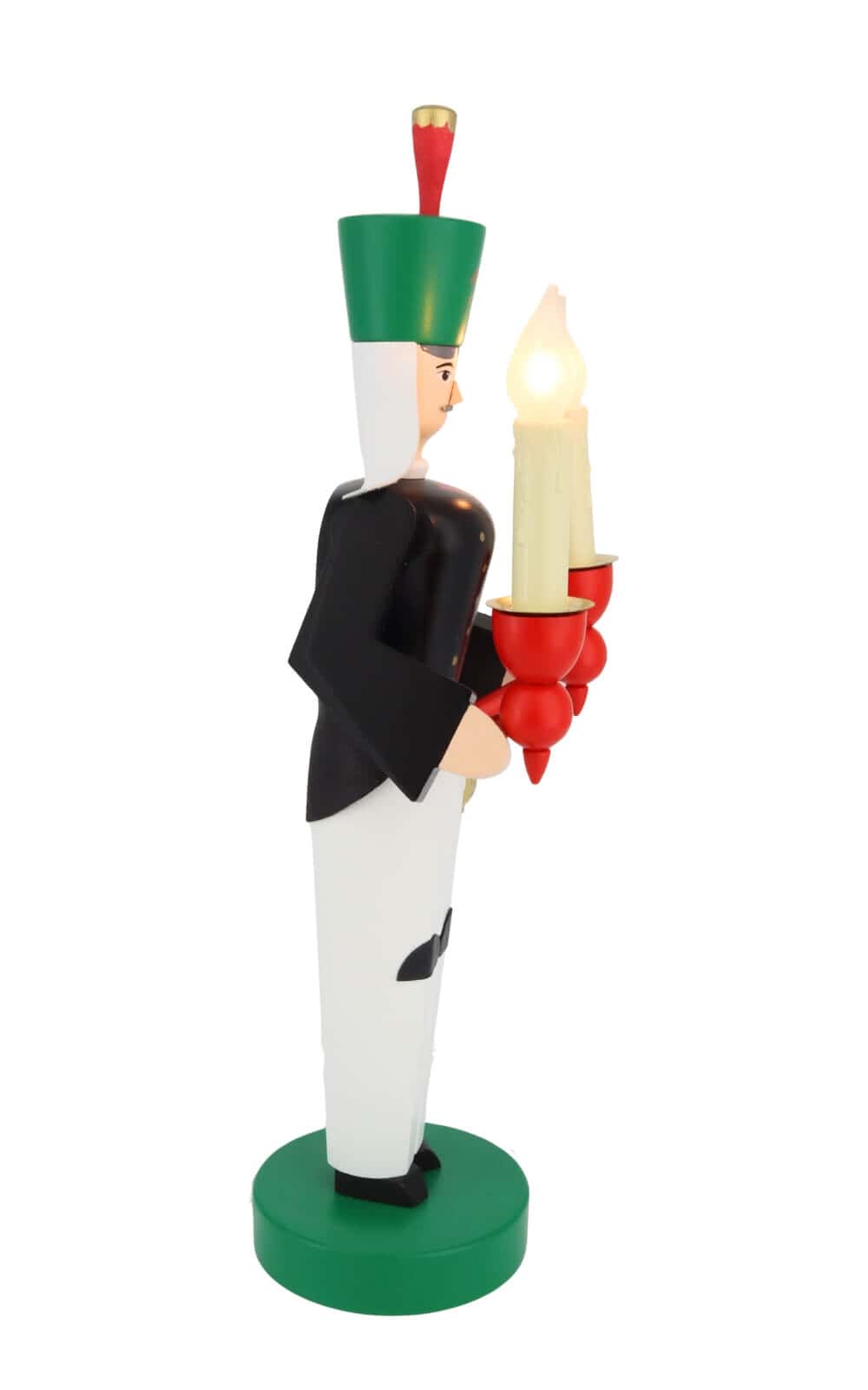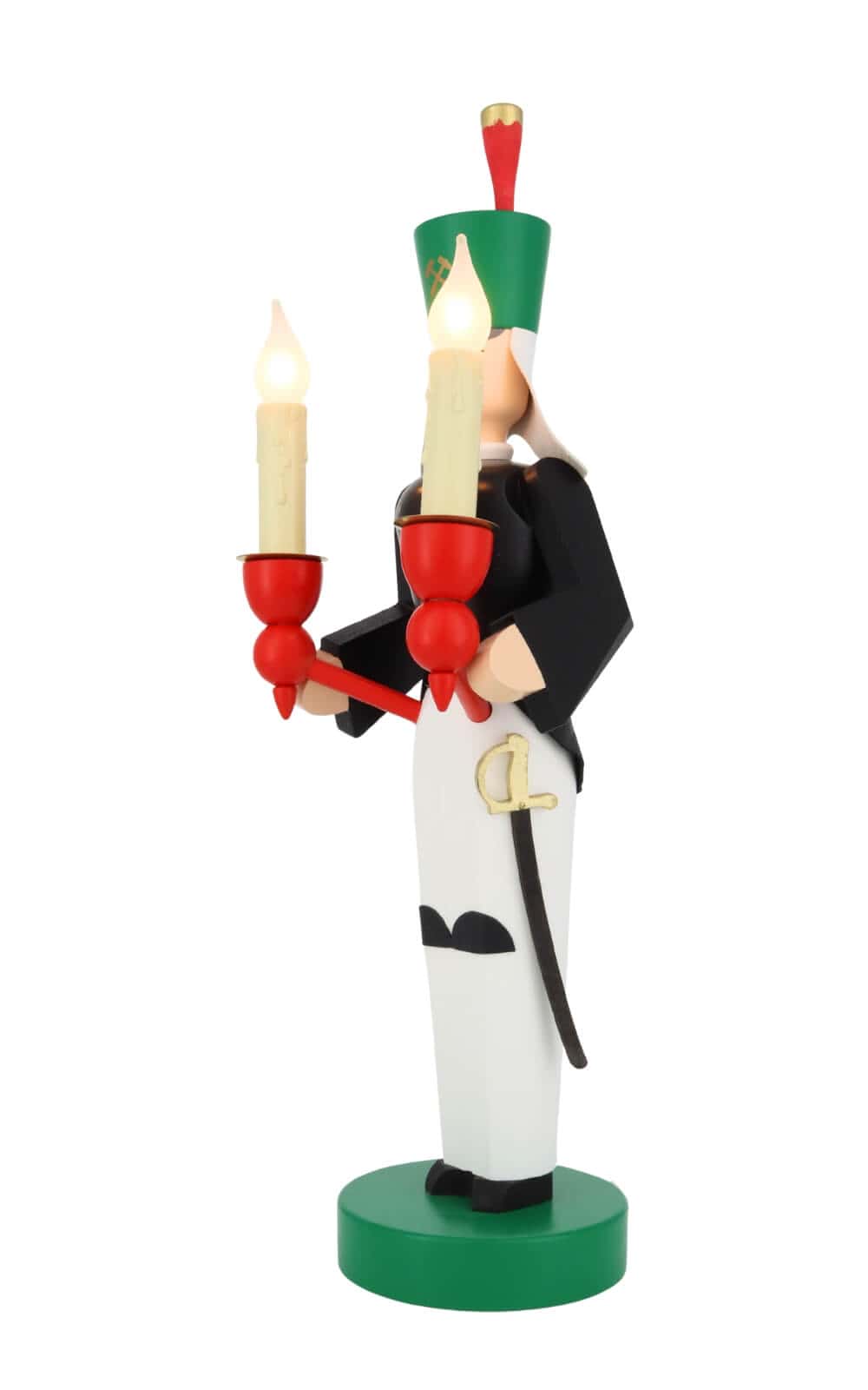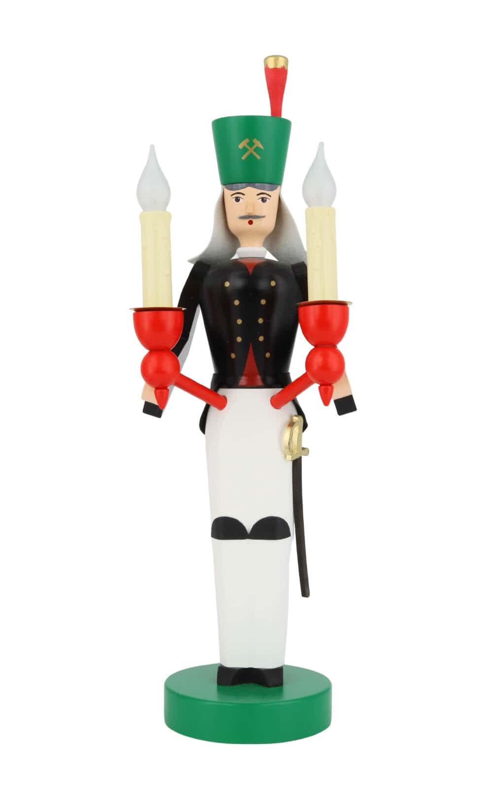 Der Bergmann trägt stolz sein Festtagsgewand, sein Habit. Der grüne Hut mit den Symbolen Hammer und Schlägel, dem Federbusch und dem Schutztuch ähnelt der Krone des Engels. Mit schwarzer Jacke und weißer Hose macht er eine stattliche Figur. An der linken Seite trägt der Bergmann seinen Säbel. Beide Figuren sind mit elektrischen Kerzen versehen, die über je eine Schalterleitung zu bedienen sind. In den Halterungen stecken Flammenkerzen, die ein romantisches flackerndes Licht verbreiten.