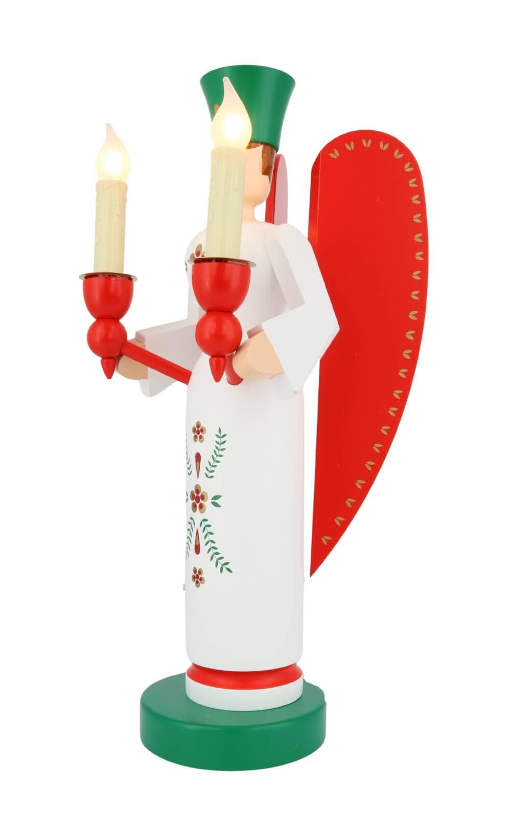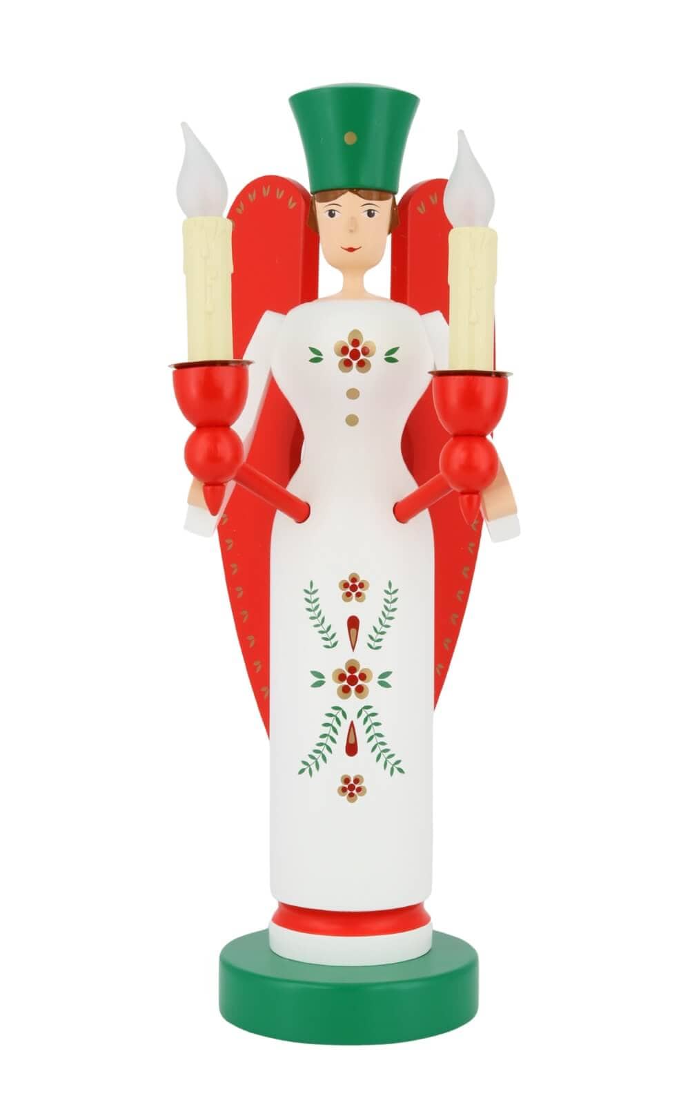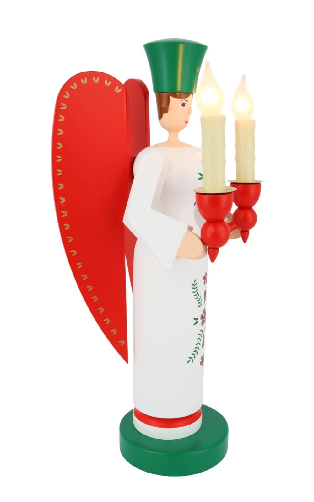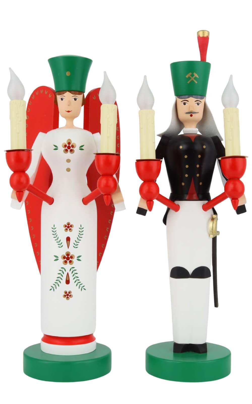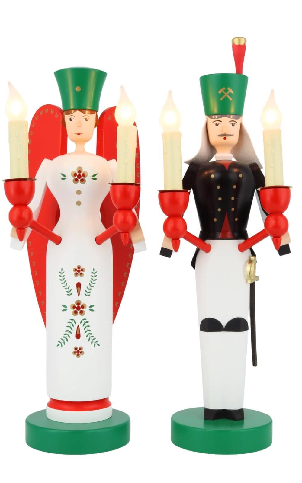 Als Symbol traditioneller Handwerkskunst sorgen Engel und Bergmann für die Magie von Weihnachten. Die sorgfältige Handarbeit und die Liebe zum Detail, die in diese Figuren einfließen, machen sie zu wertvollen Sammlerstücken und begehrten Geschenken für Weihnachtsliebhaber. Die Figuren von Richard Glässer sind in bunten Farben bemalt. Das weiße Engelskleid ist mit Ornamenten geschmückt. Die roten Flügel und Kerzenhalter und die grüne prachtvolle Krone zieren den Engel zusätzlich. Die Farben rot und grün als Farben der Liebe und Hoffnung spiegeln das Weihnachtsfest wider.