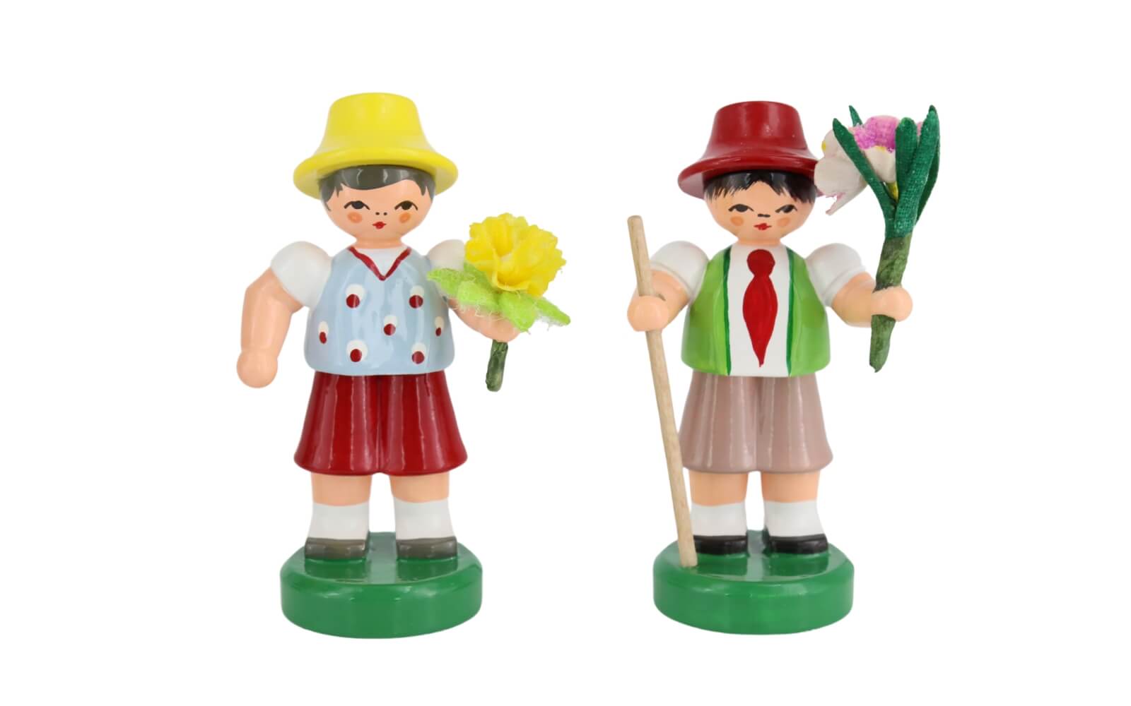 Die Blumenjungen, die im Frühling und ganzjährig Freude in jedes Zuhause bringen, sind jeweils 7 cm hoch und zeigen verschiedenste Motive, die gekonnt die Fröhlichkeit und Frische der Jahreszeiten einfangen. Ihre farbige Gestaltung wird sorgfältig von Hand aufgetragen, wodurch jede Figur zu einem Unikat wird. Diese Detailverliebtheit macht jede Figur zu einer kleinen Schatzkiste, die Geschichten aus dem Erzgebirge in sich trägt.