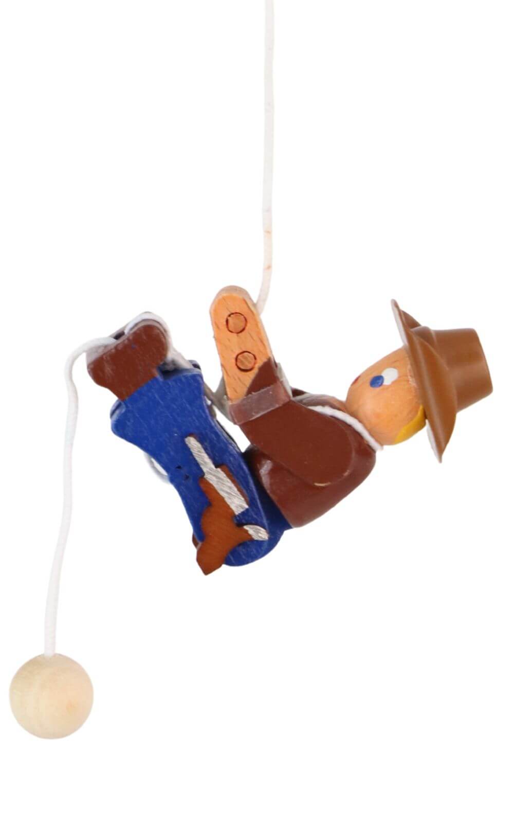 Das Besondere an der Kletterfigur Cowboy ist ihre ausgeklügelte Funktionsweise. Mittels einer innovativen Technik, bei der die Figur zentral an einem Polyamidfaden befestigt ist, kann sie durch einfaches Auseinanderziehen der beiden Schnurenden die Schnur hinaufklettern. Am oberen Ende verhindern eine Schlaufe und eine Holzkugel, dass die Figur über das Ziel hinausschießt. So wird nicht nur die Feinmotorik und das physikalische Verständnis der Kinder gefördert, sondern auch ihre Freude am Spiel. Dieses ausgeklügelte Spielzeug demonstriert, wie Tradition und moderne Technik Hand in Hand gehen können.