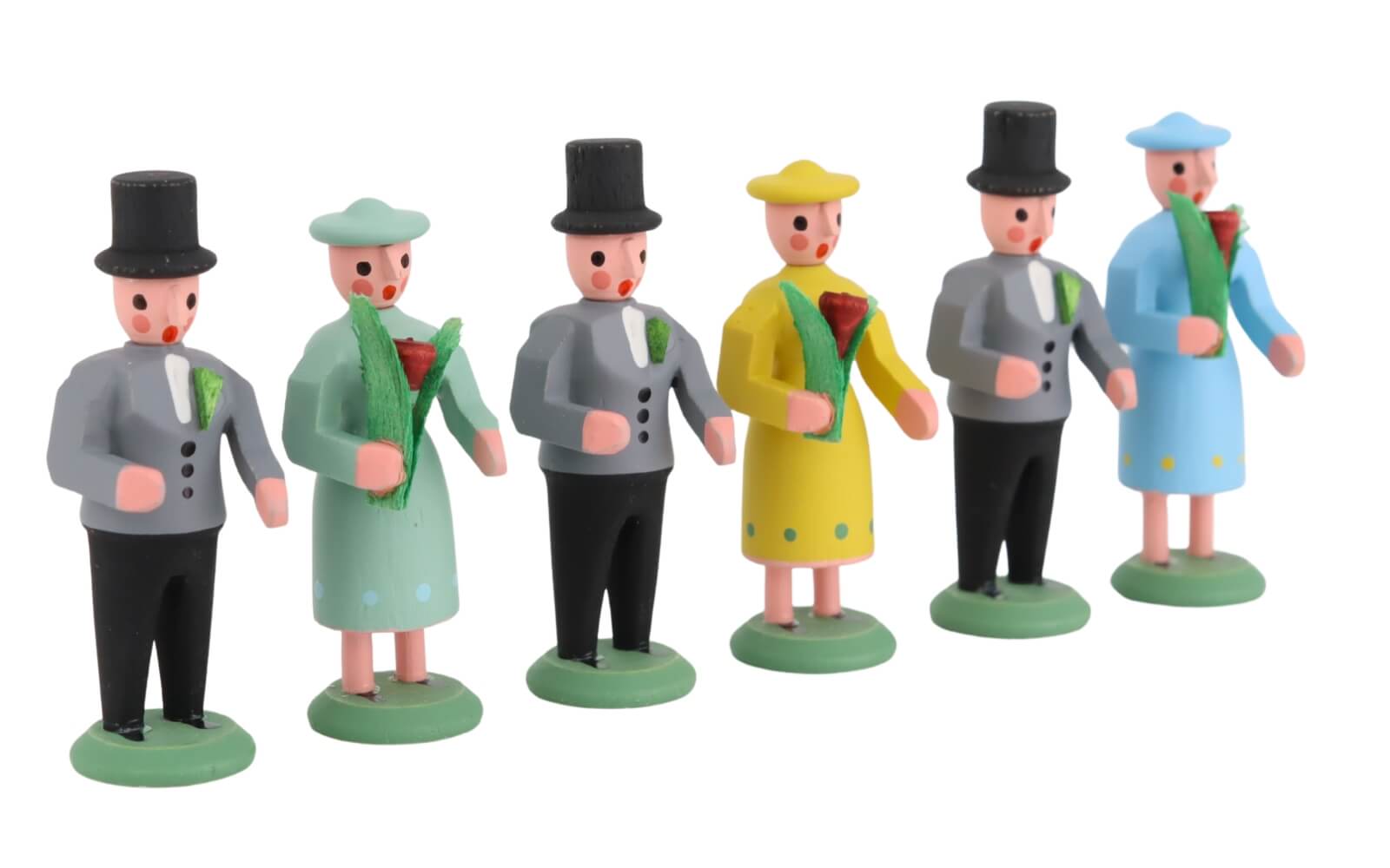 Der Miniatur Brautzug ist ein Paradebeispiel für die klassische Handwerkskunst, die das Erzgebirge berühmt gemacht hat. Bestehend aus sechs detailliert gearbeiteten Figuren, die eine fröhliche Hochzeitsgesellschaft darstellen, bringt dieses Ensemble die Freude und das Fest der Liebe in Ihr Zuhause. Die farbige Gestaltung der Figuren fügt eine lebendige Note hinzu, die in jedem Raum einen Blickfang bietet.