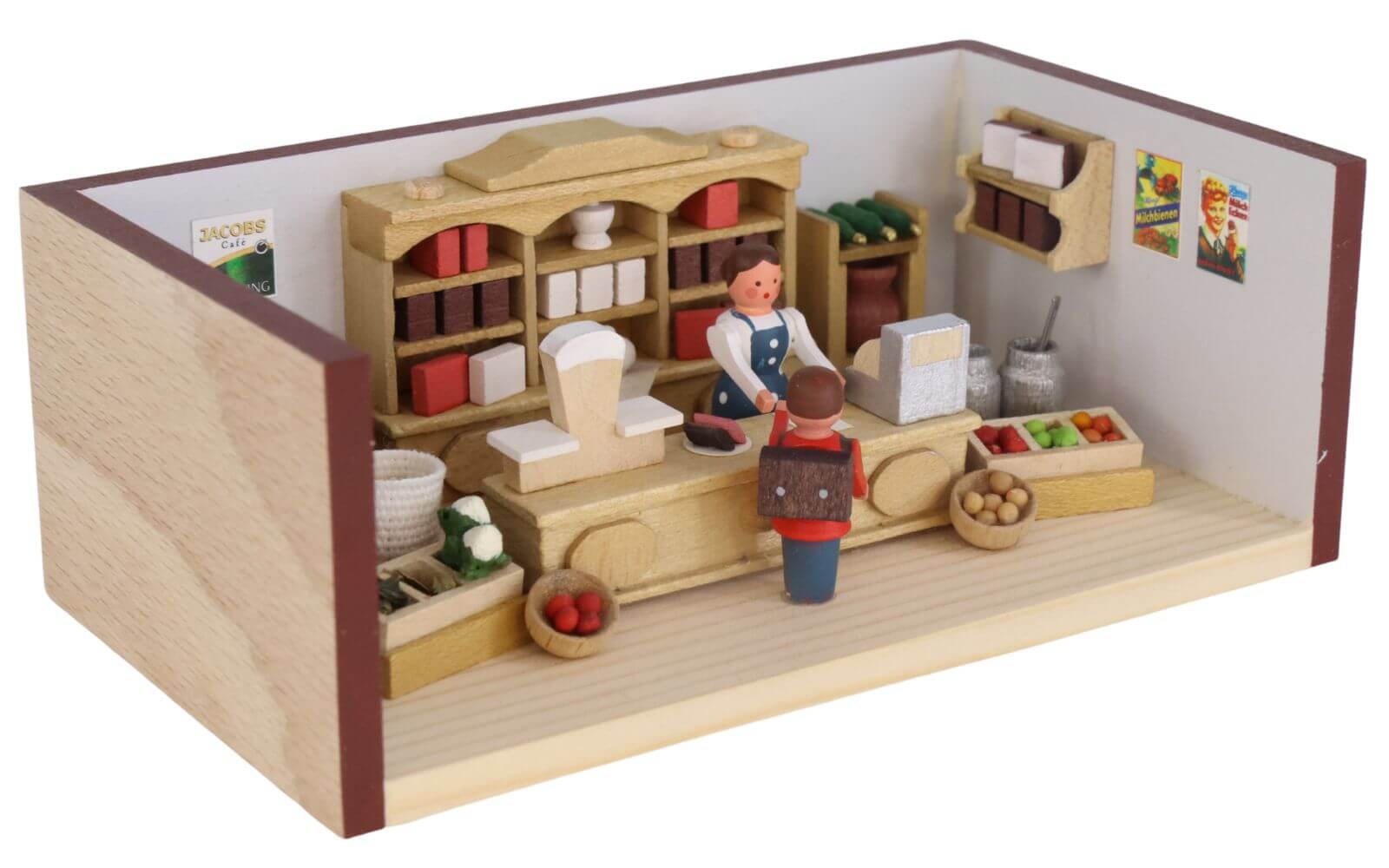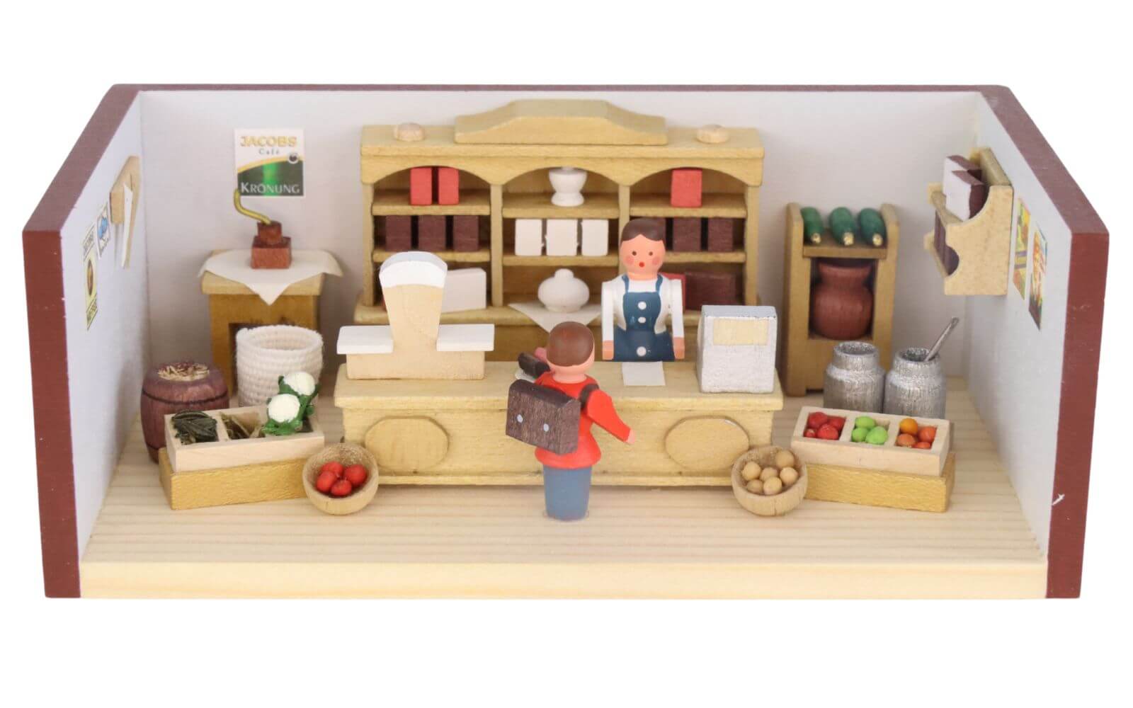 Von den kleinen Figuren bis zu den winzigen Produkten auf den Regalen wird jedes Element sorgfältig gestaltet, um die Atmosphäre und den Charme eines traditionellen Tante-Emma-Ladens einzufangen. Ein Schulkind besucht das Geschäft, um vielleicht ein paar Süßigkeiten für den langen Schulweg zu kaufen. Die Verkäuferin bedient ihn freundlich hinter dem langen Verkaufstresen, auf dem eine Waage und eine Registrierkasse Platz finden. Hinter der Dame ist ein Regal mit vielen kleinen Dingen in Dosen und Verpackungen zu sehen.