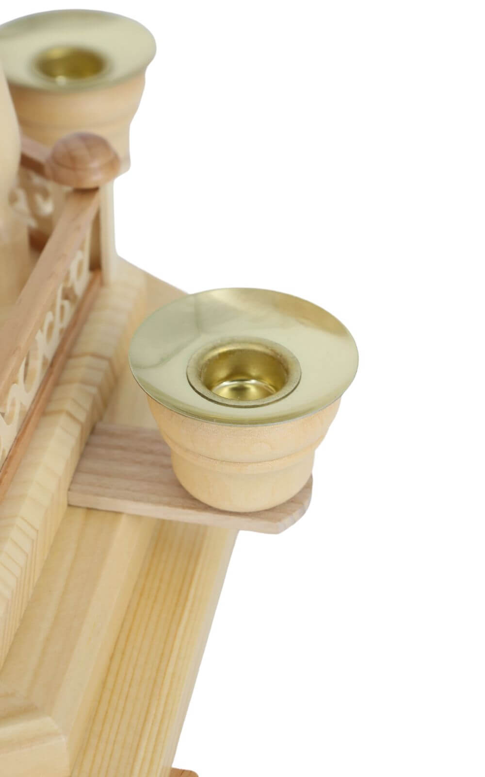 Sechs goldfarbene Kerzenhalter aus Metall sind rund um den Sockel angebracht und fassen Pyramidenkerzen mit einem Durchmesser von 14 mm. Sobald die Kerzen entzündet werden, steigt die warme Luft nach oben und setzt die Figuren langsam in Bewegung. Dieses sanfte Drehen der Pyramide schafft eine beruhigende Atmosphäre, die Kinder und Erwachsene gleichermaßen fasziniert. Das lebendige Lichtspiel macht die Weihnachtspyramide zu einem Mittelpunkt Ihrer festlichen Dekoration – sei es auf dem Tisch, auf einer Kommode oder im Fenster.