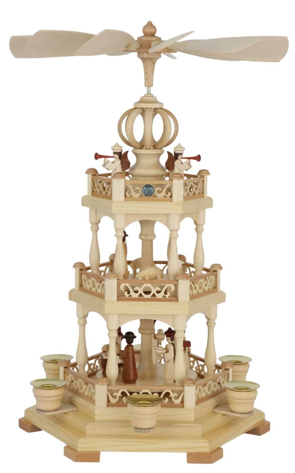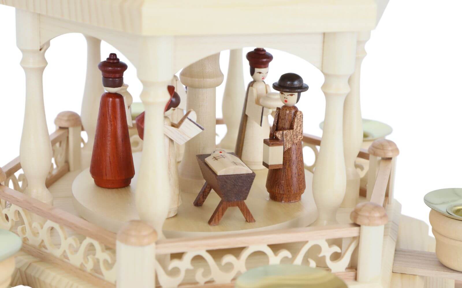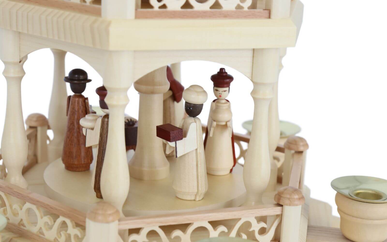 Auf den drei Stockwerken entfaltet sich die biblische Weihnachtsgeschichte mit handgeschnitzten Figuren. Im unteren Bereich sind die Heiligen Drei Könige mit ihren Geschenken dargestellt, die sich ehrfürchtig dem Christkind in der Krippe nähern. Auf der mittleren Ebene wachen die Hirten mit ihren Schafen und verleihen der Szenerie eine warme Bodenständigkeit. Im oberen Bereich begleiten Engel mit Trompeten die Szene, ihre Flügel aus Holz setzen kunstvolle Akzente und verstärken den feierlichen Eindruck. Den Abschluss bildet die imposante Flügelkrone mit den Rotorflügeln, die durch die aufsteigende Wärme der Pyramidenkerzen angetrieben werden.