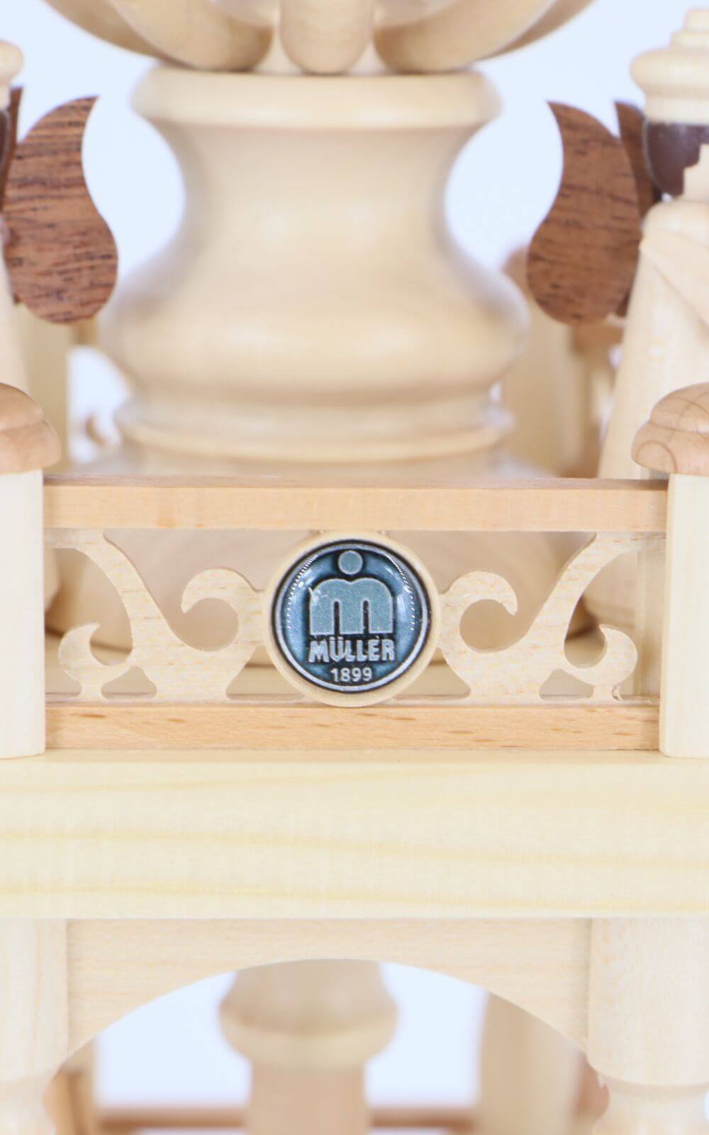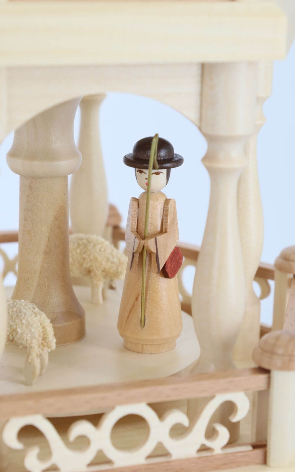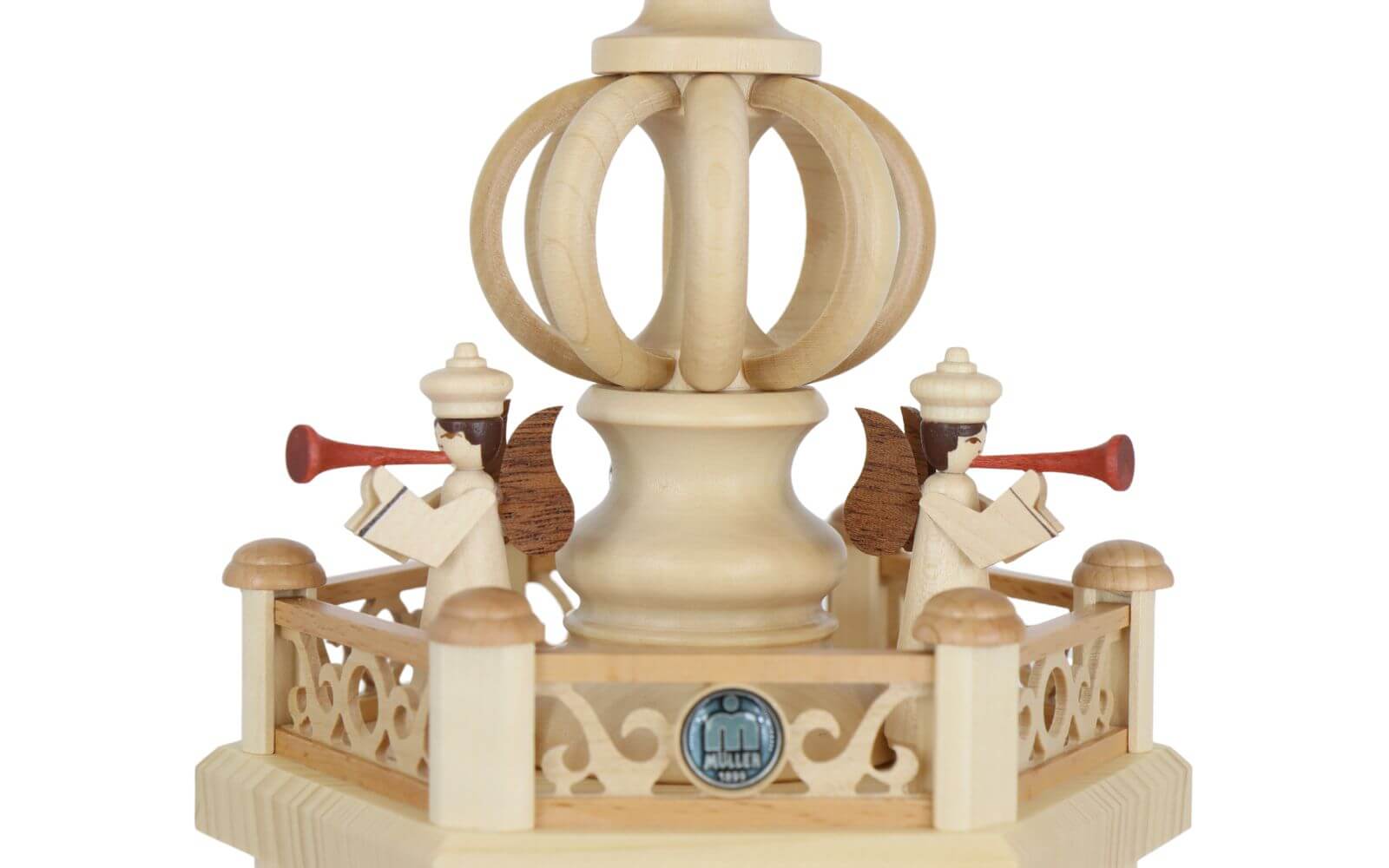 Auf den drei Stockwerken entfaltet sich die biblische Weihnachtsgeschichte mit handgeschnitzten Figuren. Im unteren Bereich sind die Heiligen Drei Könige mit ihren Geschenken dargestellt, die sich ehrfürchtig dem Christkind in der Krippe nähern. Auf der mittleren Ebene wachen die Hirten mit ihren Schafen und verleihen der Szenerie eine warme Bodenständigkeit. Im oberen Bereich begleiten Engel mit Trompeten die Szene, ihre Flügel aus Holz setzen kunstvolle Akzente und verstärken den feierlichen Eindruck. Den Abschluss bildet die imposante Flügelkrone mit den Rotorflügeln, die durch die aufsteigende Wärme der Pyramidenkerzen angetrieben werden.