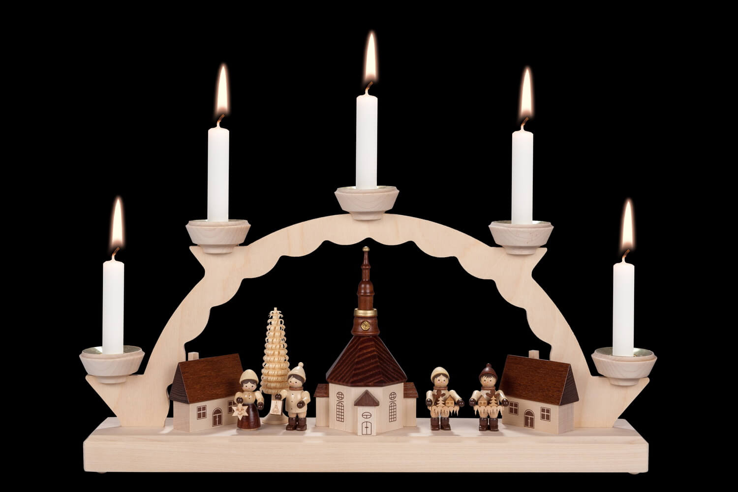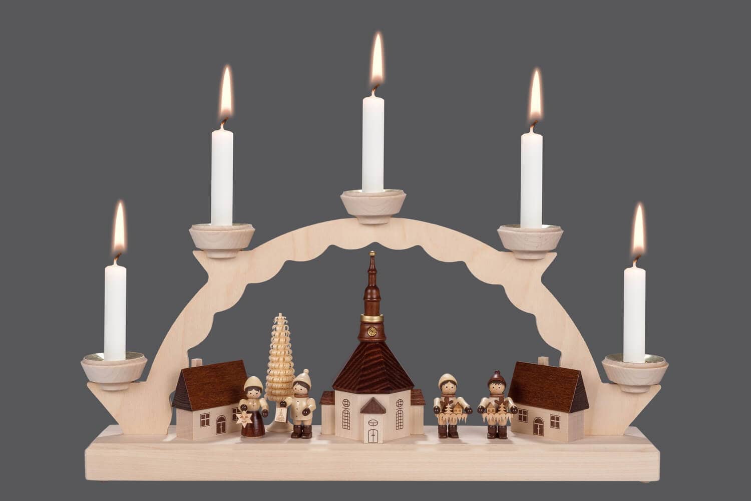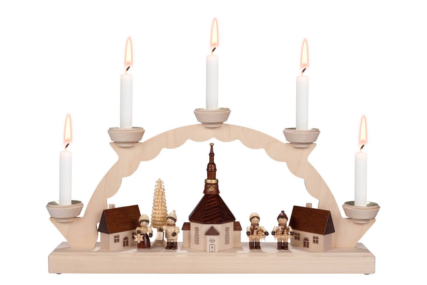 Die Beleuchtung mit fünf Wachskerzen, die speziell für diesen Schwibbogen ausgewählt wurden, verleiht Ihrem Raum ein sanftes und warmes Licht, das die Freude und Besinnlichkeit der Adventszeit und des Weihnachtsfestes unterstreicht. Die Kerzen selbst sind so konzipiert, dass sie sicher und harmonisch mit dem Design des Schwibbogens integrieren.