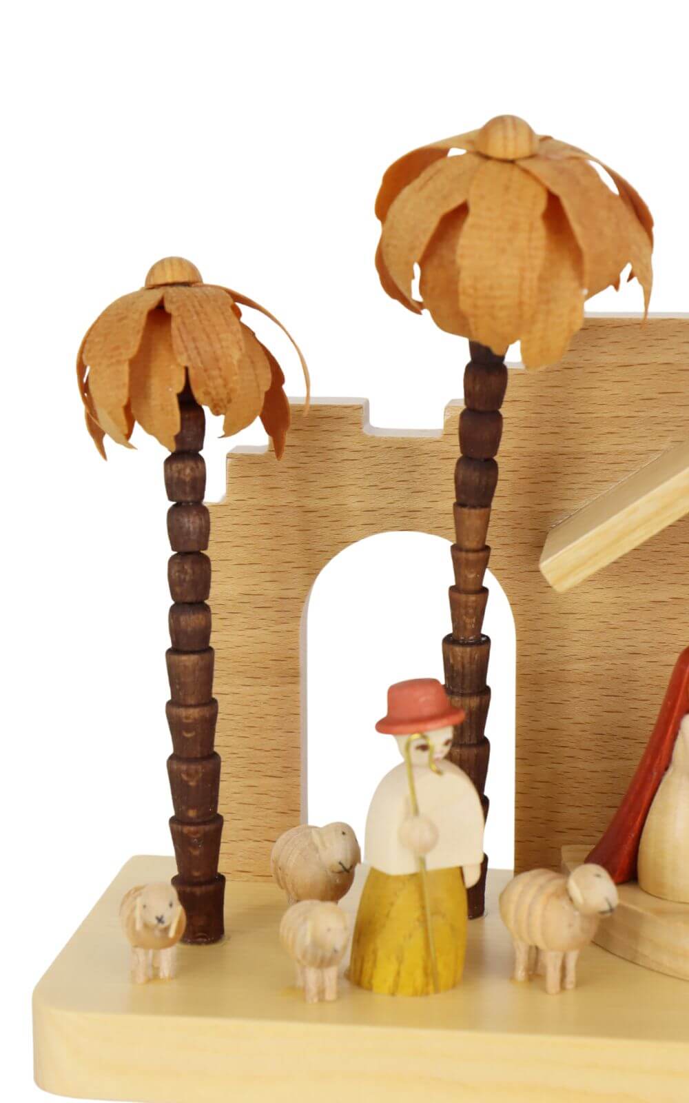 Der Kerzenhalter "Christi Geburt" zeichnet sich durch seine hochwertige Verarbeitung aus einheimischen Hölzern wie Ahorn, Buche, Erle, Esche, Fichte, Linde und Kiefer aus. Diese natürlichen Materialien verleihen dem Kerzenhalter nicht nur eine warme, einladende Farbgebung, sondern auch eine langlebige und robuste Qualität. Das klassische Design in natürlichen Farben passt sich harmonisch jeder weihnachtlichen Dekoration an und hebt die Darstellung der Geburt Christi in einer orientalischen Szene besonders hervor.
