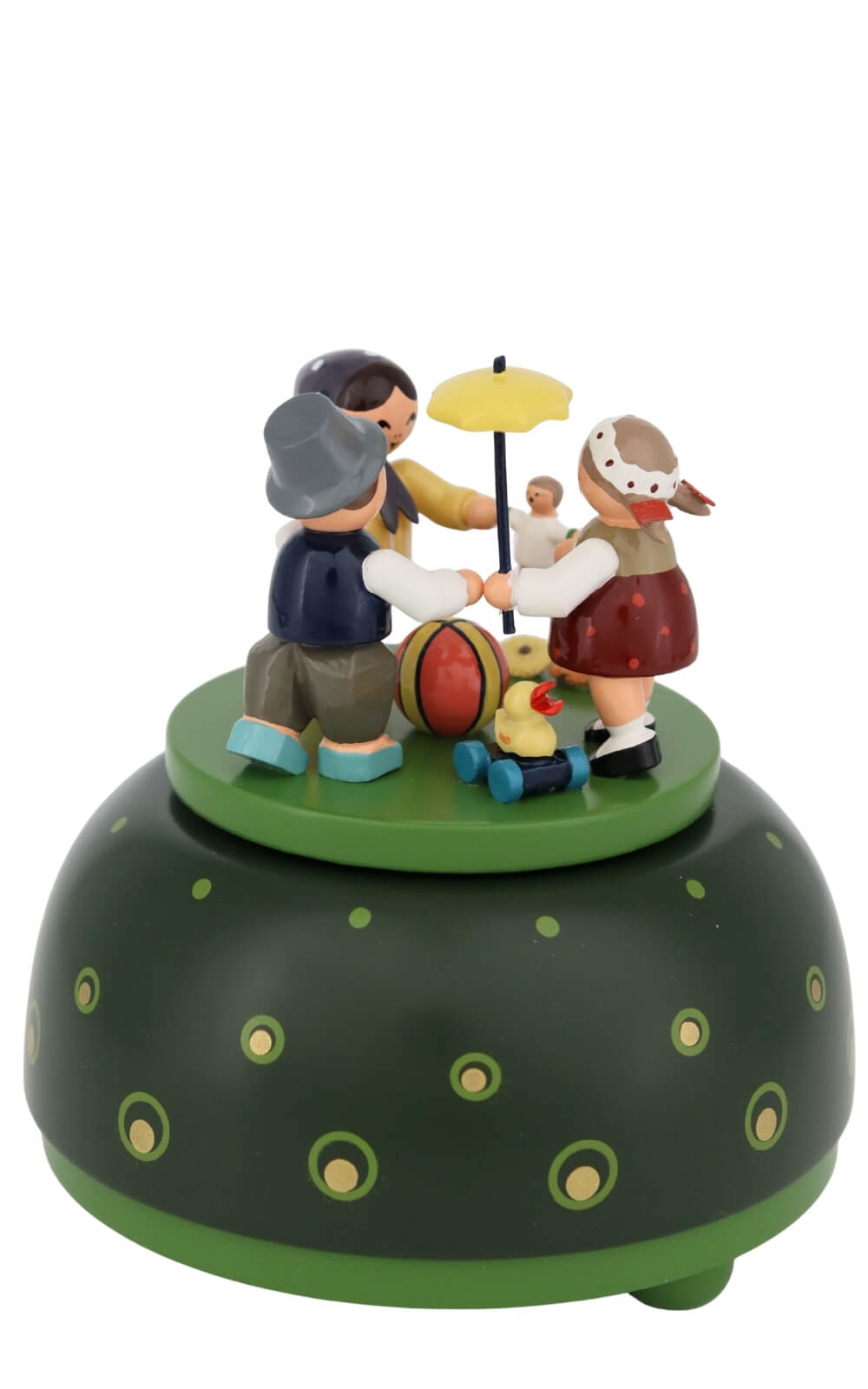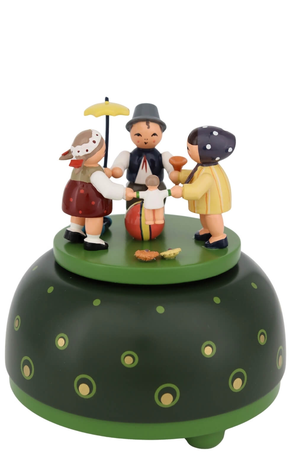 Die Spieluhr & Spieldose Kinderreigen mit Melodie: Hopp, hopp, hopp von KWO ist ein liebevoll gestaltetes Meisterstück erzgebirgischer Handwerkskunst, das nostalgischen Charme und feinste Holzverarbeitung vereint. Mit ihrer fröhlichen Szenerie – tanzende Kinder, bunte Kleidung, ein Ball und ein gelber Schirm – lässt sie Erinnerungen an unbeschwerte Kindertage lebendig werden. Die harmonische Farbkombination aus sattem Grün und lebendigen Akzenten schafft ein warmes, einladendes Gesamtbild.