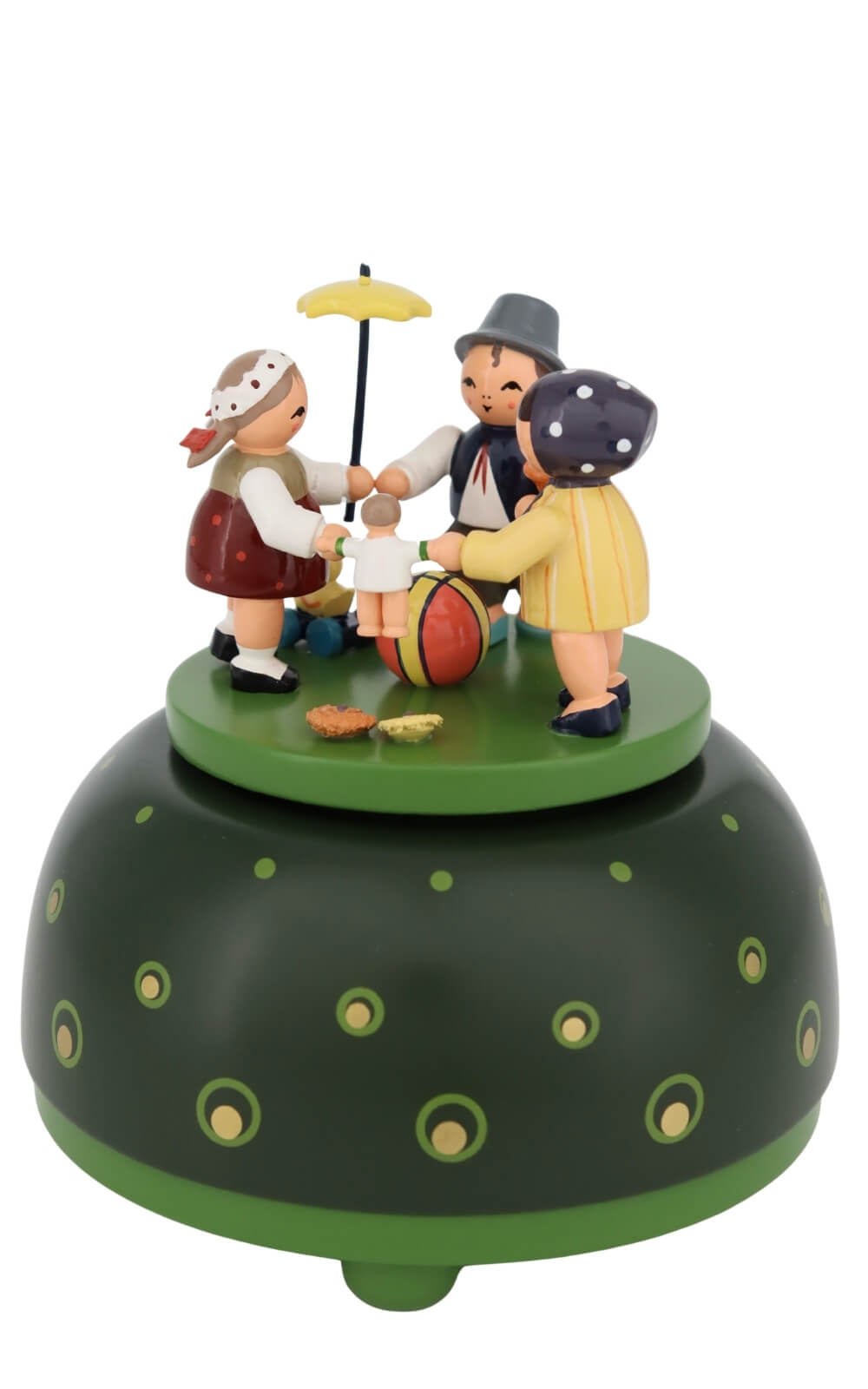 Gefertigt aus heimischen Hölzern wie Buche, Ahorn und Linde, steht diese Spieldose aus dem Erzgebirge für höchste Qualität und authentisches Kunsthandwerk. Die Figuren sind von Hand bemalt und mit liebevollen Details versehen – von den ausdrucksstarken Gesichtern bis hin zu den kleinen Blümchen auf dem Sockel. Der runde grüne Korpus mit feinen Punktmustern bildet die Basis für das mechanische Spielwerk, das per Handaufzug von unten betrieben wird. Sobald die Melodie „Hopp, hopp, hopp…“ erklingt, beginnt sich die Szene sanft zu drehen und bringt Bewegung in das liebevoll inszenierte Kinderleben.