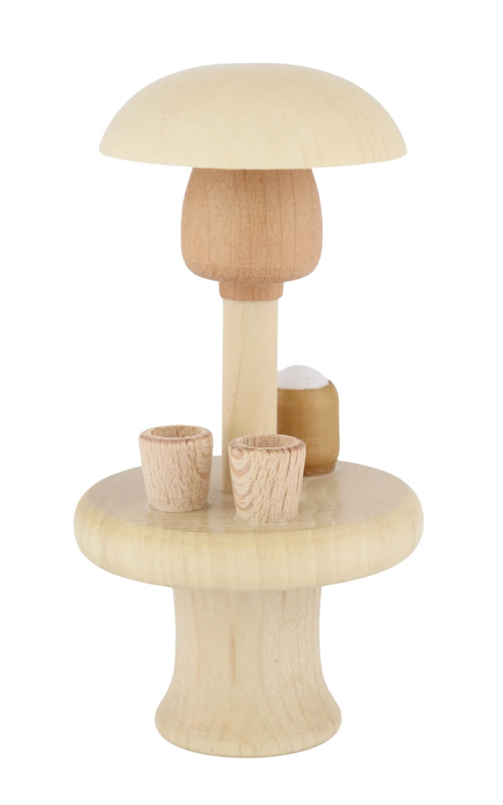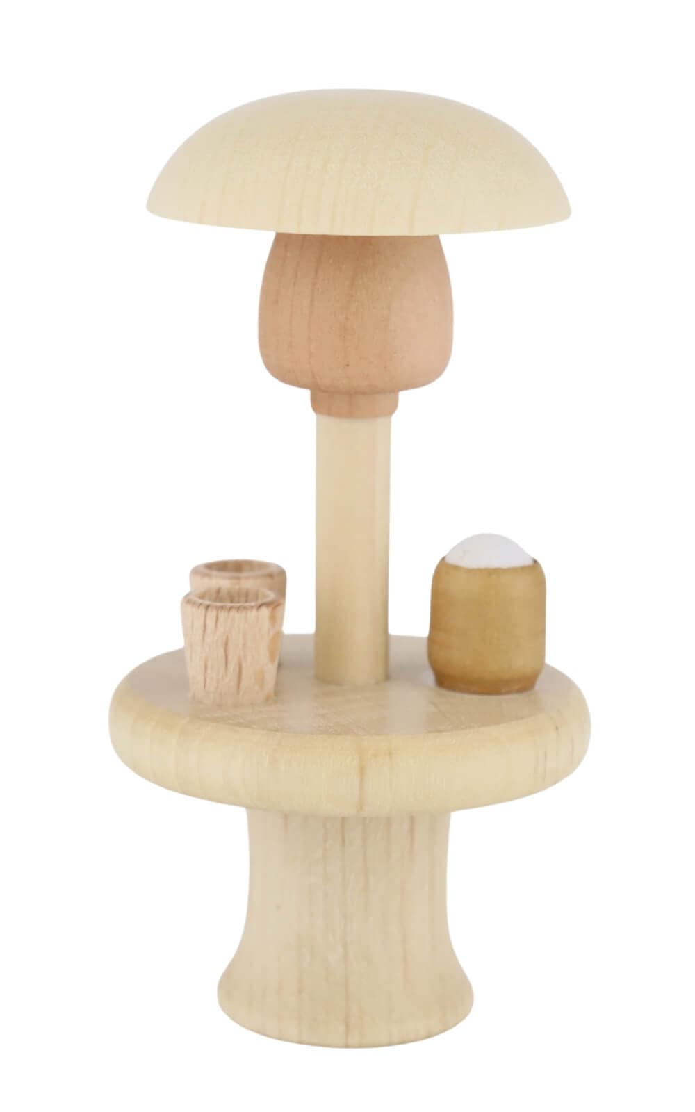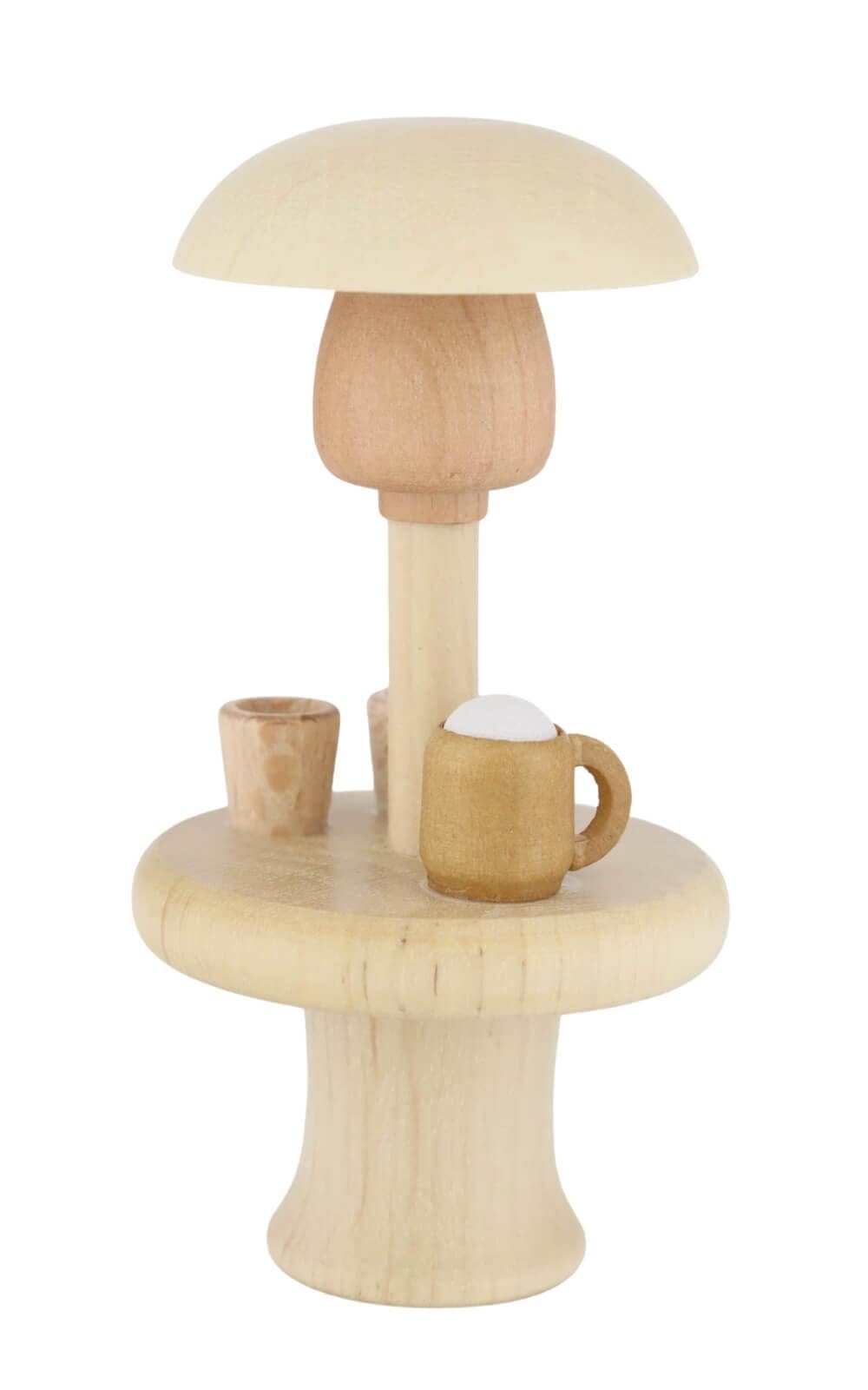 Die Miniatur zeigt einen kleinen Pilz mit ausladendem Hut, der als schützendes Dach über einem runden Tisch dient. Darauf finden sich winzige Holzkrüge und Becher, die das Bild einer gemütlichen Runde vervollständigen. Die klare Linienführung und die feinen Holzstrukturen geben der Figur eine besondere Lebendigkeit. Mit einer Höhe von 7 cm und einer Breite von 4 cm ist der Wärmepilz mit Tisch kompakt genug, um auf Fensterbänken, Vitrinen oder kleinen Regalen zu wirken, und gleichzeitig auffällig genug, um Aufmerksamkeit auf sich zu ziehen.