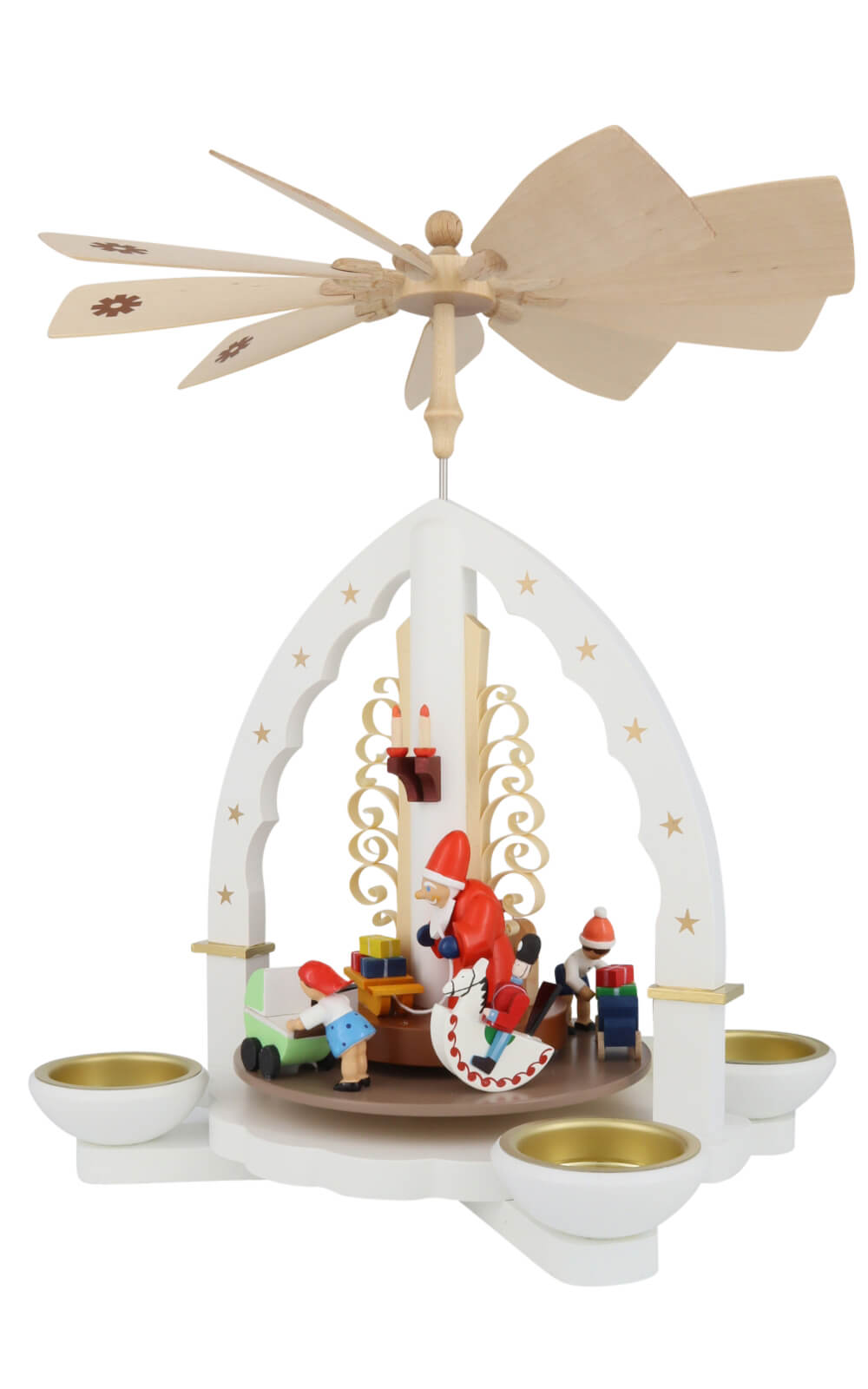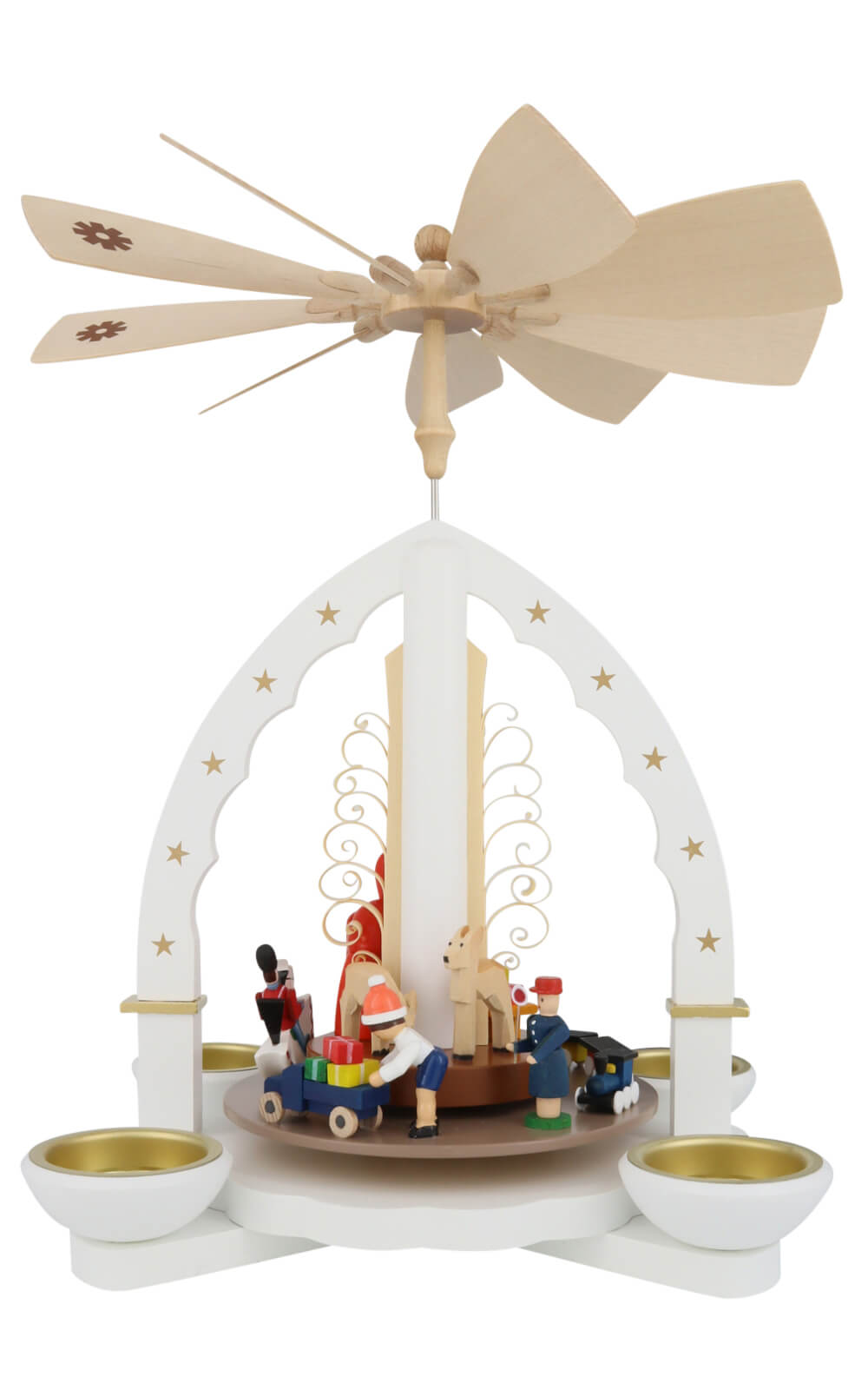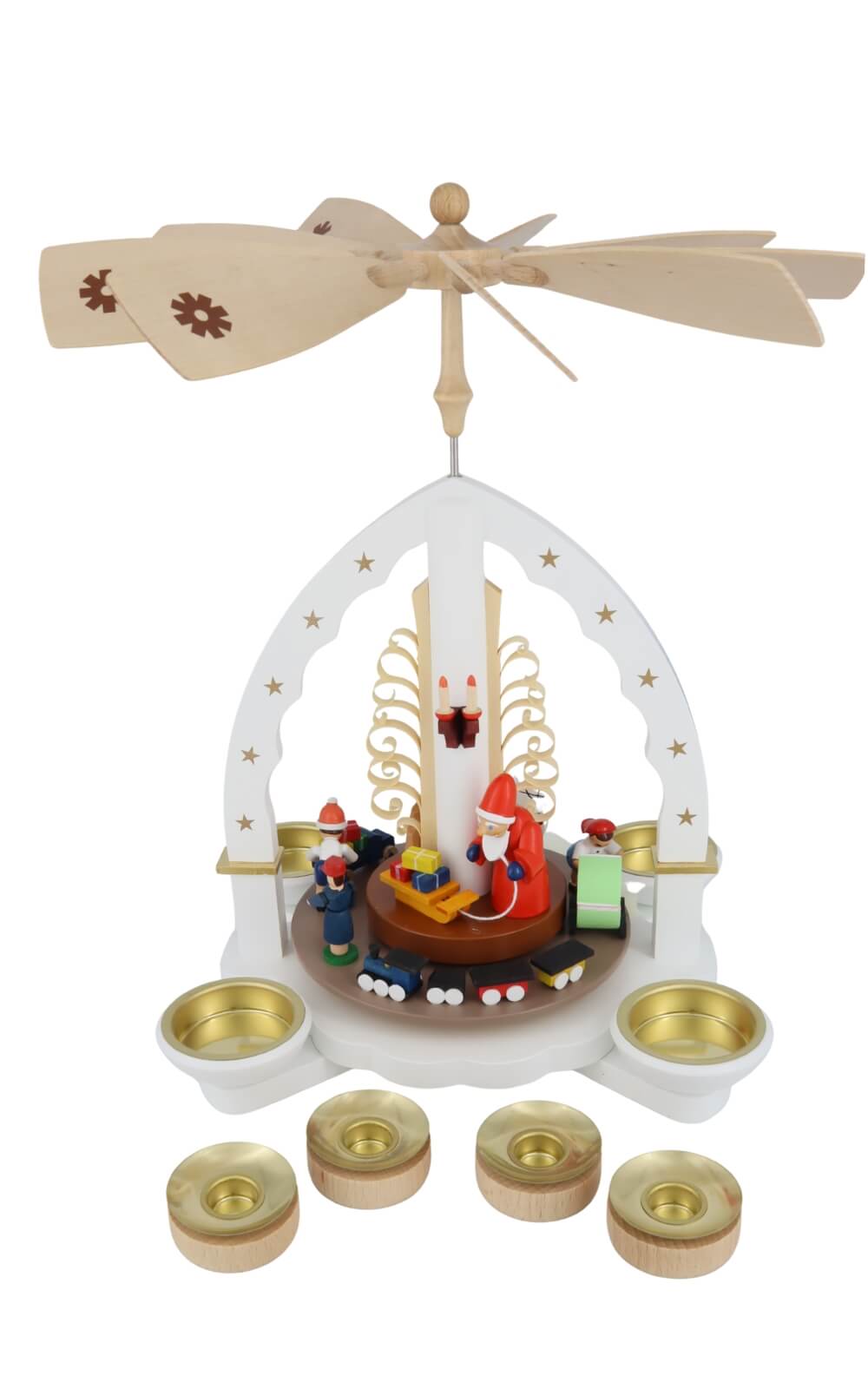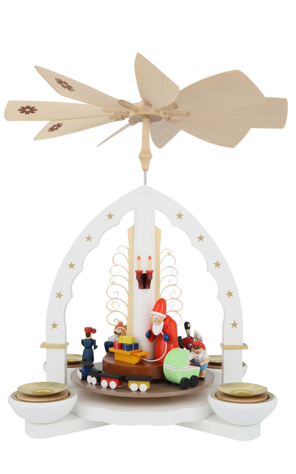 Vier goldfarbene Kerzenschalen umgeben den Sockel und nehmen Pyramidenteelichter oder 14 mm-Pyramidenkerzen auf. Sobald das warme Kerzenlicht aufsteigt, setzt es den zarten Propeller mit eingelegten Schneeflockenmotiven in Bewegung. Die Plattform dreht sich leise, sodass sich die Weihnachtspyramide Weihnachtsbescherung, weiß, 28 cm von Richard Glässer wie von selbst in eine lebendige Wintergeschichte verwandelt. Jede Figur ist handbemalt: die rote Zipfelmütze des Nikolaus, das hellgrüne Babyköpfchen im Wagen oder das blaue Kleid des spielenden Mädchens – alles spiegelt die Liebe zum Detail wider, für die Richard Glässer bekannt ist.