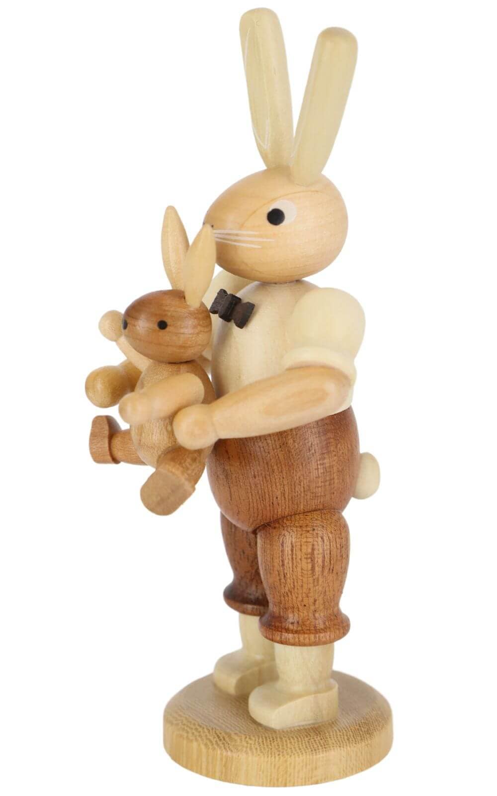 The Easter bunny father with child is made by the renowned Müller Kleinkunst in the heart of the Ore Mountains. The combination of traditional design and high-quality craftsmanship makes these figurines a special highlight of any Easter decoration. Each figurine is a testament to the craftsmanship "Made in Germany", made from local woods and finished with a love of detail, that can be felt in every fiber.