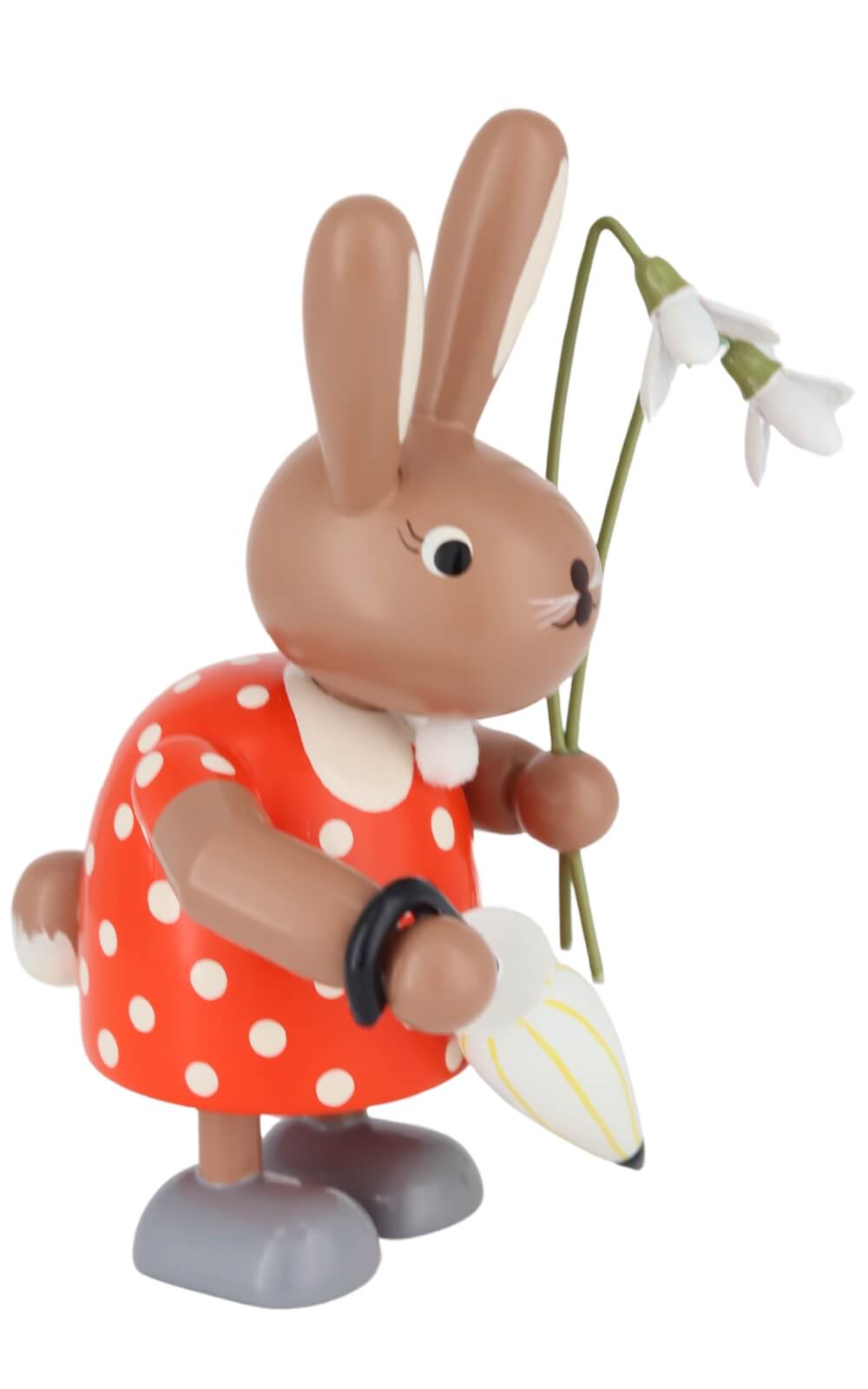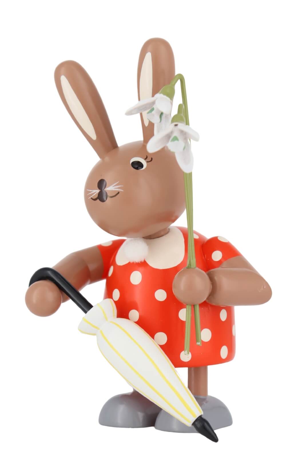 Where does high-quality craftsmanship show itself? - First of all, of course, in its appearance! Just like this Easter bunny, all folk art items from the Erzgebirge are made by hand with precision. The Easter bunny is finely hand-painted. She is dressed in a red polka-dotted dress and has an umbrella in case the bunny is caught out by a rain shower. She is holding the first flowers of spring - snowdrops. Spring is finally arriving and with this figurine, it's also coming to your home.