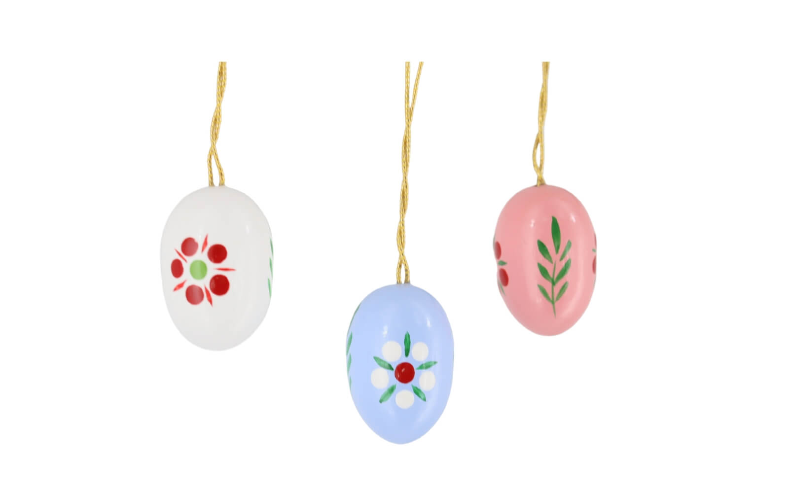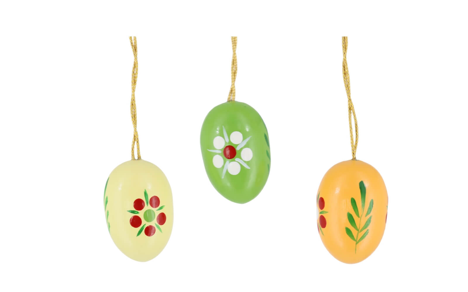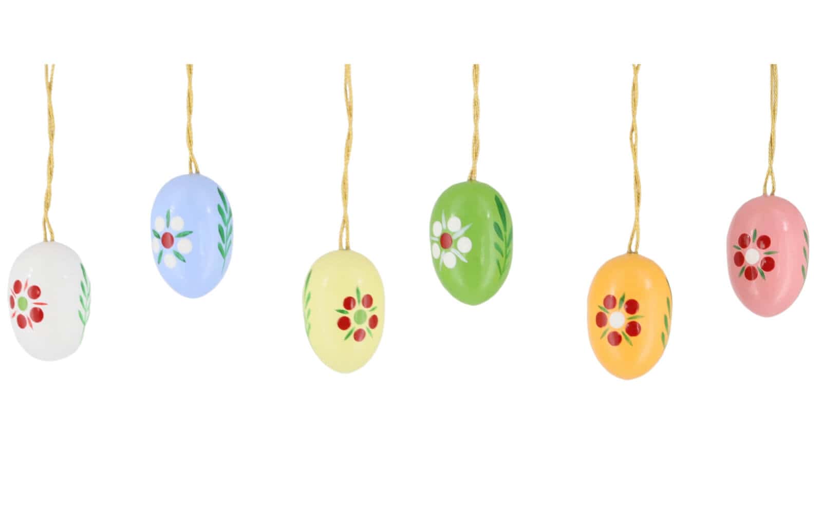 The Easter eggs with fine flowers you get in set of 6. They are 2 cm tall and can be safely hung on the golden thread on any Easter bouquet. Special attention is paid to the painting of the colorful eggs. They are painted in six different colors, yellow, green, red, orange, blue and white. On each egg are the same blossoms and leaves painted by hand. They differ only in the colors. With fine strokes, the petals and leaf ornament are applied. Only high-quality paints and varnishes are used.