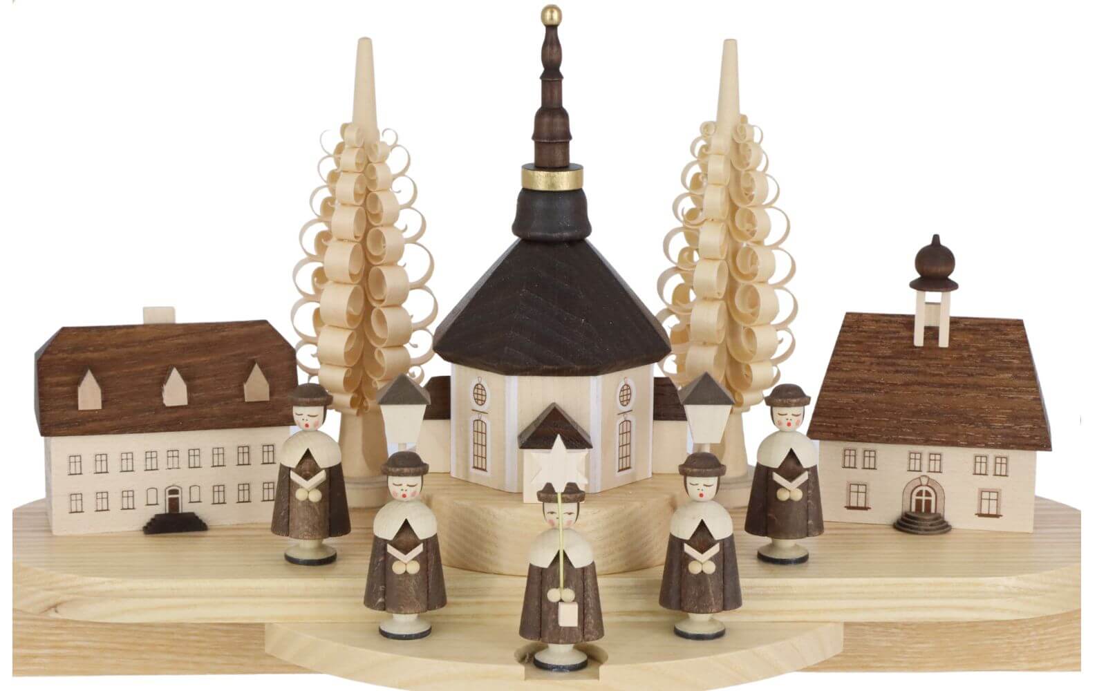 The candle arch Seiffen village takes you to the small world-famous village. Müller Kleinkunst, like many other companies, is a family-run manufacturer with a long tradition. The candle arch shows the company's attachment to the village, its customs and traditions, especially at Christmas time. The famous baroque Seiffen round church is the focal point of the picture and is enthroned on an extra base in the middle of the candle arch. The village scene is surrounded by striking Seiffen buildings. On the left is the town hall and on the right the old school. Both buildings are just a stone's throw away from the church and are among the oldest buildings in the small village. A typical old-style miner's house forms the end to the right and left. They can still often be found in the toy village today.