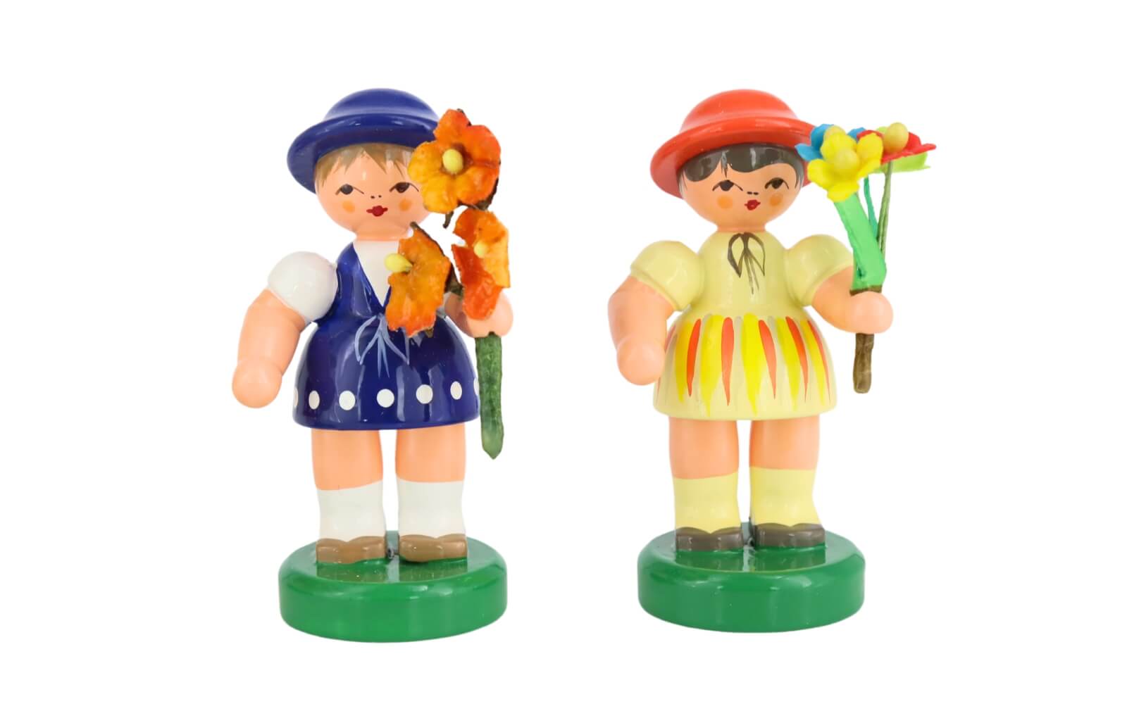 The flower girls from Seiffen in the Erzgebirge embody the commitment to quality, by being made from high-quality, local woods such as maple, beech, alder and spruce. Each figurine is a hand-painted work of art, carefully designed and detailed. Measuring 7 cm high, 4 cm wide and 4 cm long, they fit effortlessly into any decoration and attract everyone's attention. As miniatures, they perfectly capture the essence of spring,but are also suitable for a year-round presentation.
