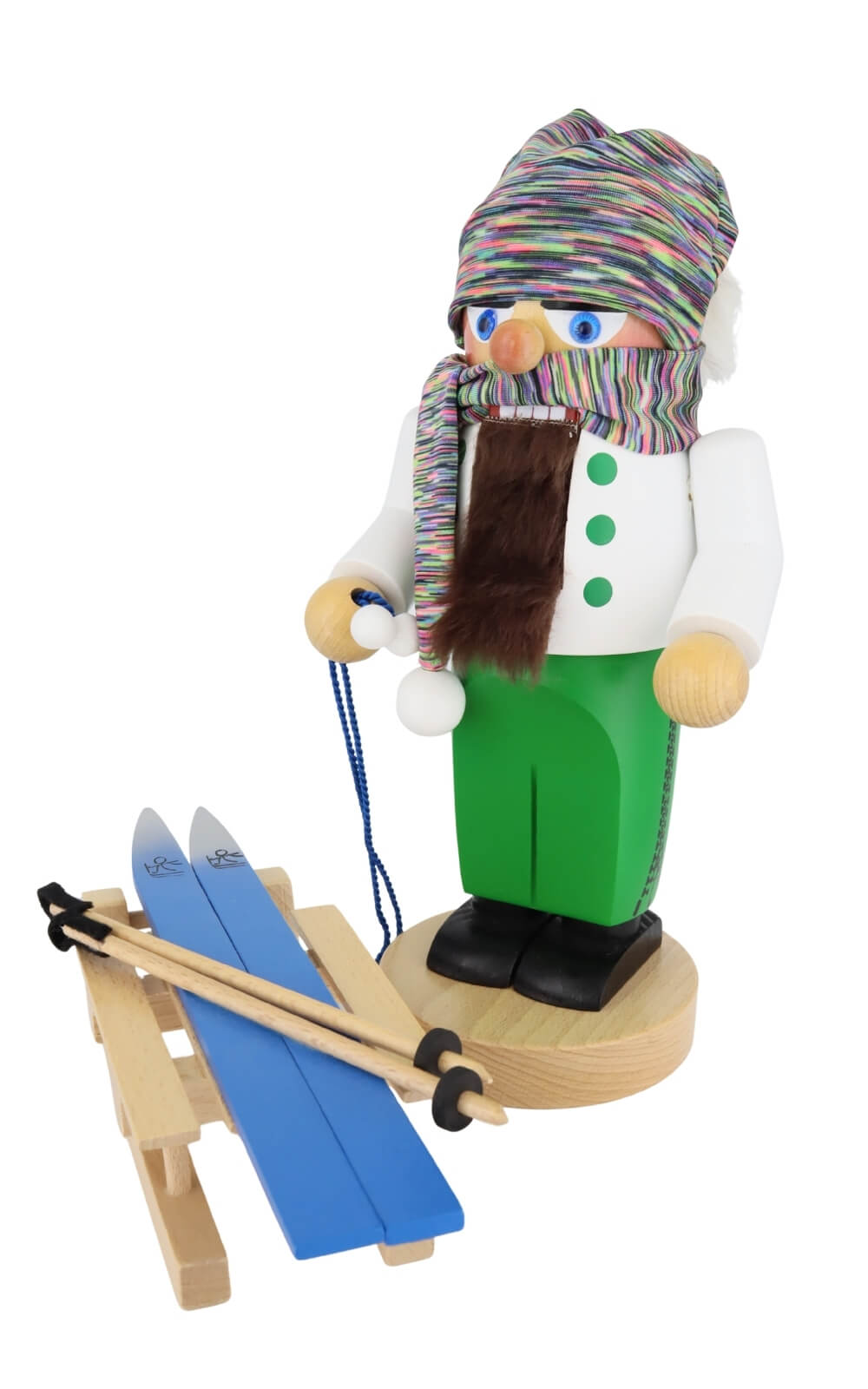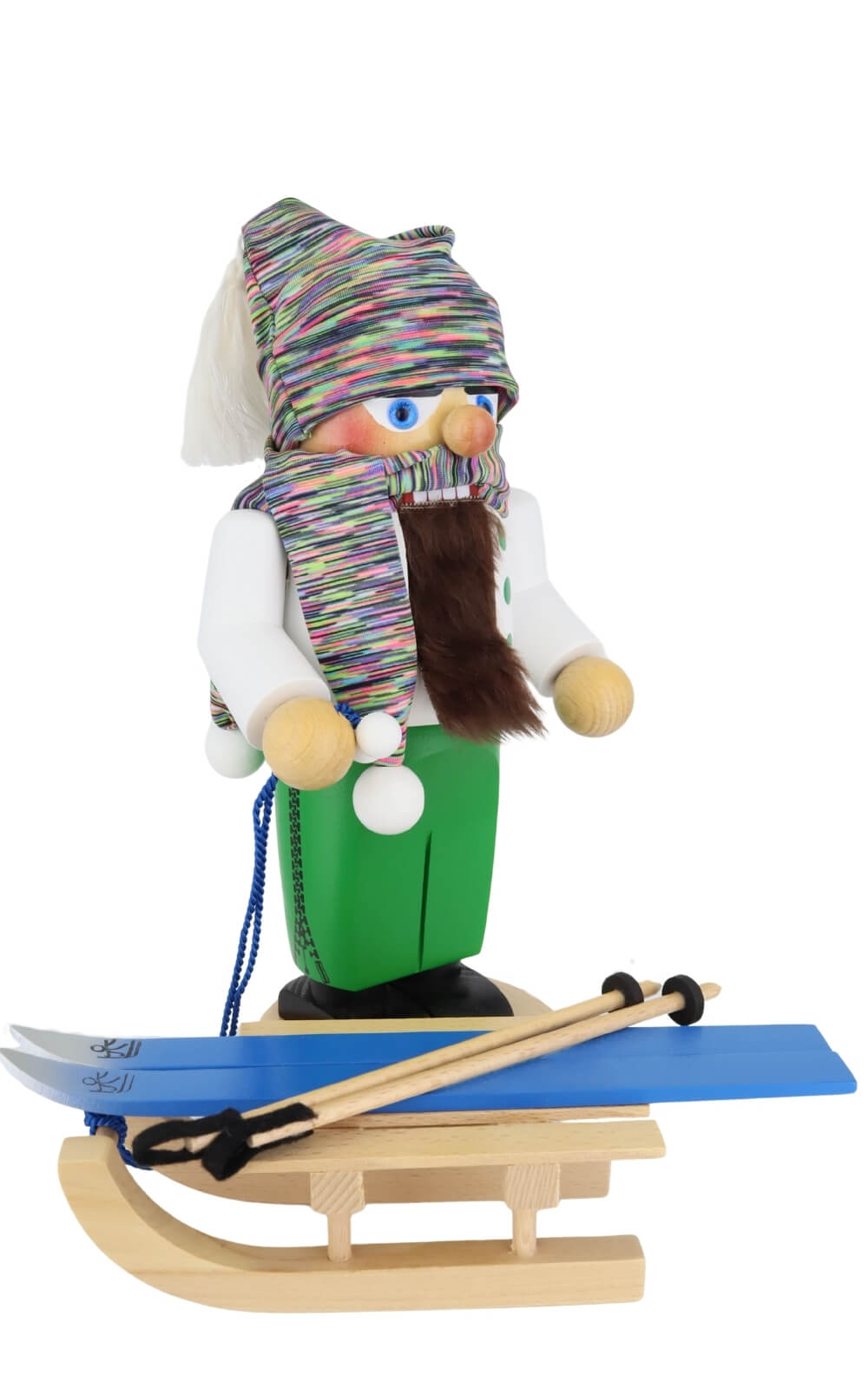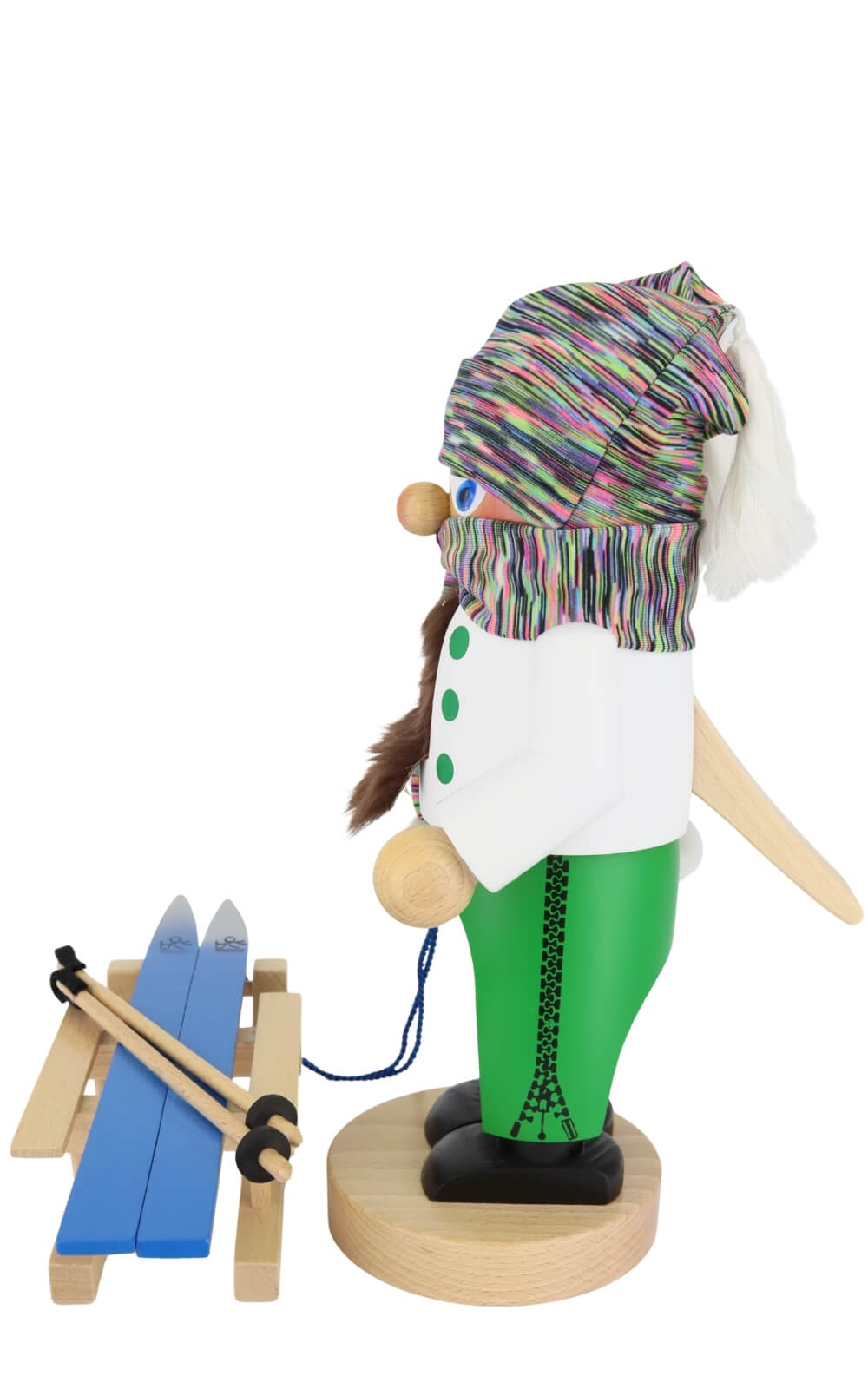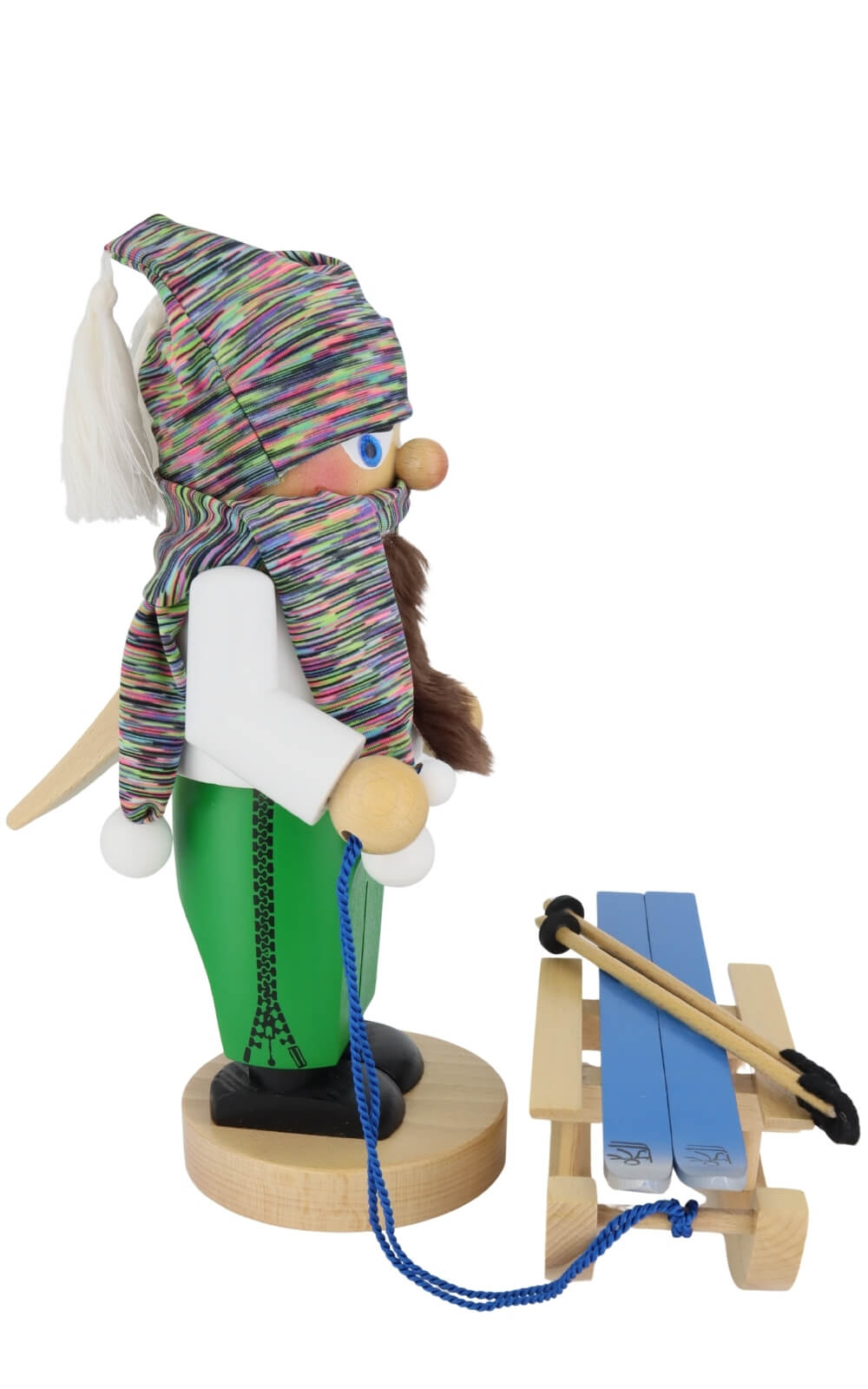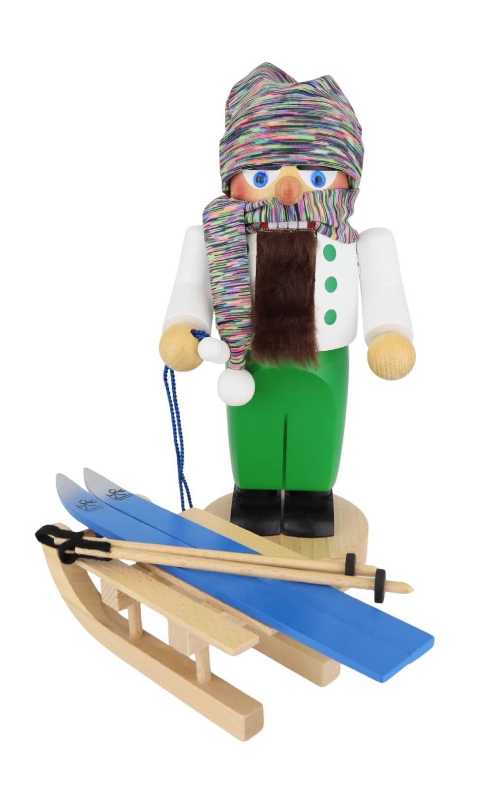 The figure of the skier on this unusual nutcracker brings a touch of winter sports and alpine flair into your home. Colorful and designed with great attention to detail, the nutcracker skier is a real eye - catcher. As befits a skier, the figure is dressed with warm hat and scarf. These accessories are intricately knitted. On a sled the winter sportsman transports his skis and ski poles to the downhill slope.
