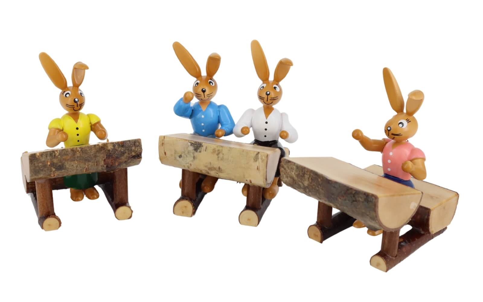 Bunny schools are a popular motif at Easter time. Must nevertheless the hare children the multiplication tables of the egg painting and egg hiding first learn. In addition also the arithmetic, because one should know as Easter hare already, how many Easter eggs in the gardens must be hidden. The Hare school from the manufacture of wood art Gahlenz visit at present 5 hare children. All Easter hares unite an important detail - the Knickohren. By it one recognizes immediately the Easter hares by Gahlenz.