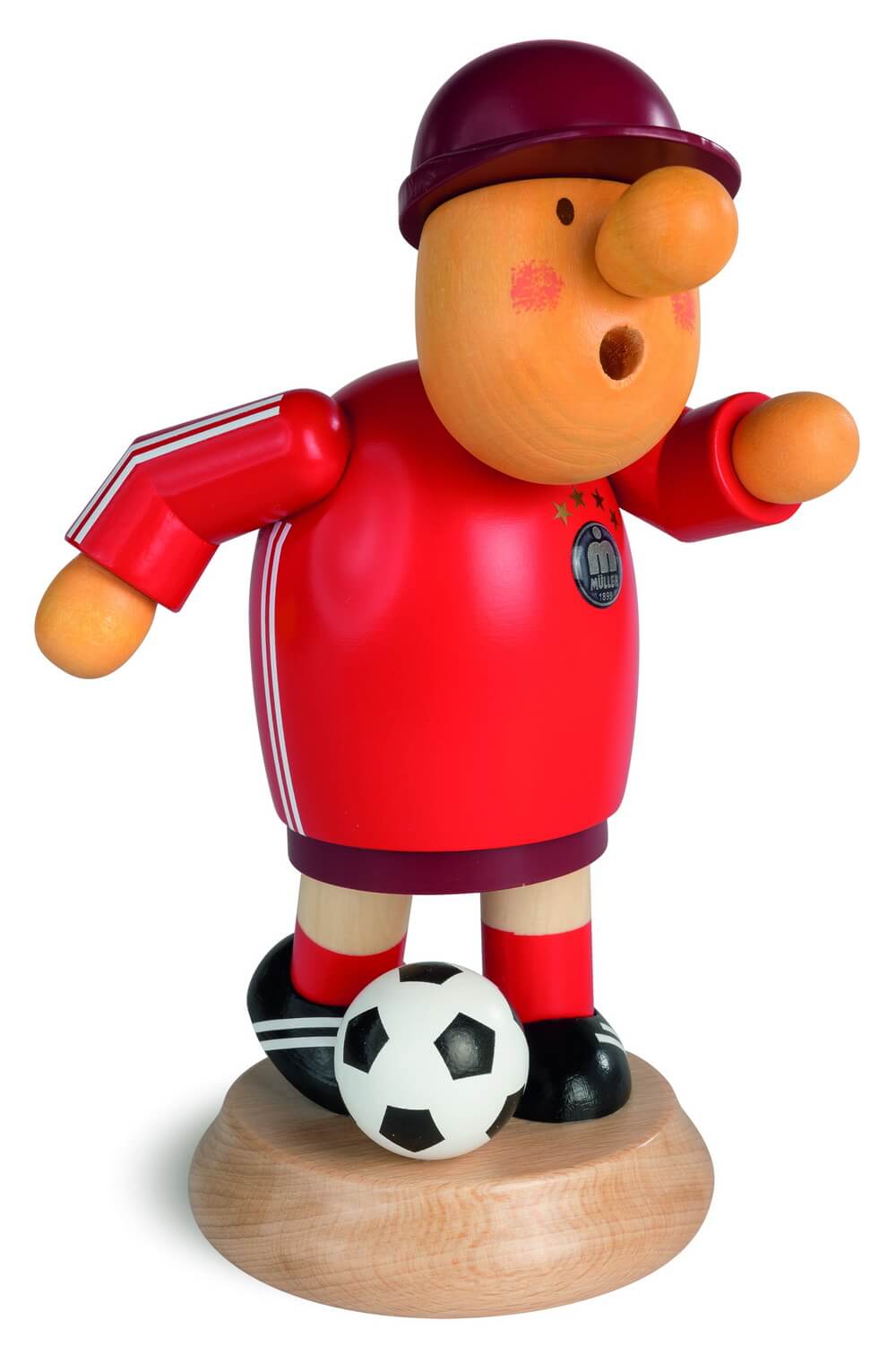With its headquarters in Seiffen in the Erzgebirge, the Müller GmbH Kleinkunst is deeply rooted in the tradition of the smoking man craft. The handmade figures of the company captivate with their attention to detail and high quality. This smoking man is wearing a red kit and is ready to score goals. He's already got the soccer ready.