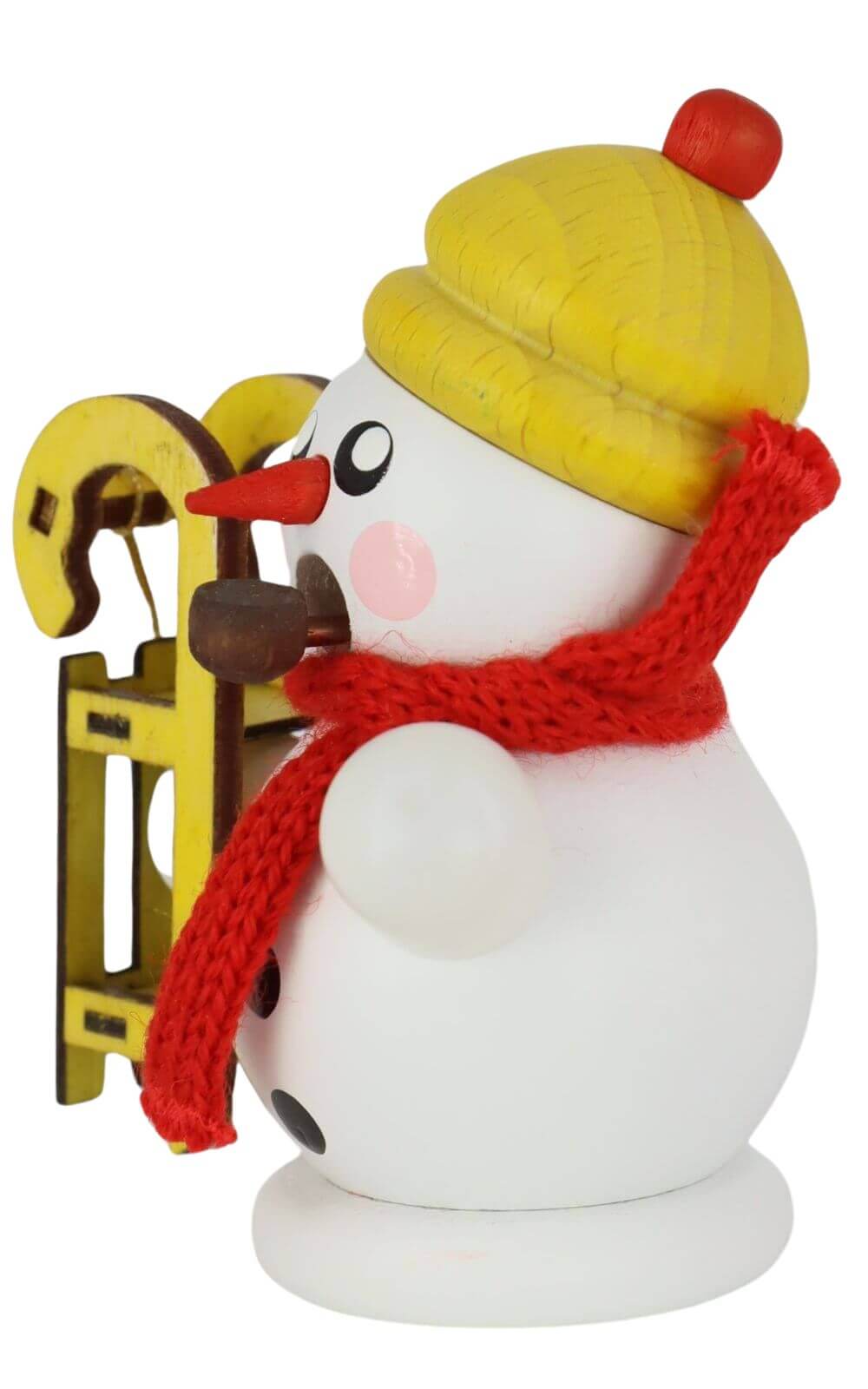 The Smoker Figurine Snowman with Sled, white by Gerd Hofmann captures the essence of winter fun and festive spirit. The snowman, with its white wooden body, yellow hat, and bright red scarf, is holding a handcrafted sled in warm yellow and brown tones. His red carrot nose, rosy cheeks, and painted buttons bring this figure to life and make it an endearing highlight for any holiday setting.