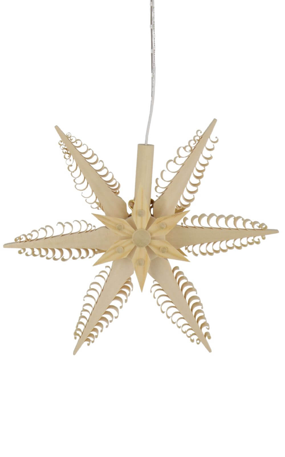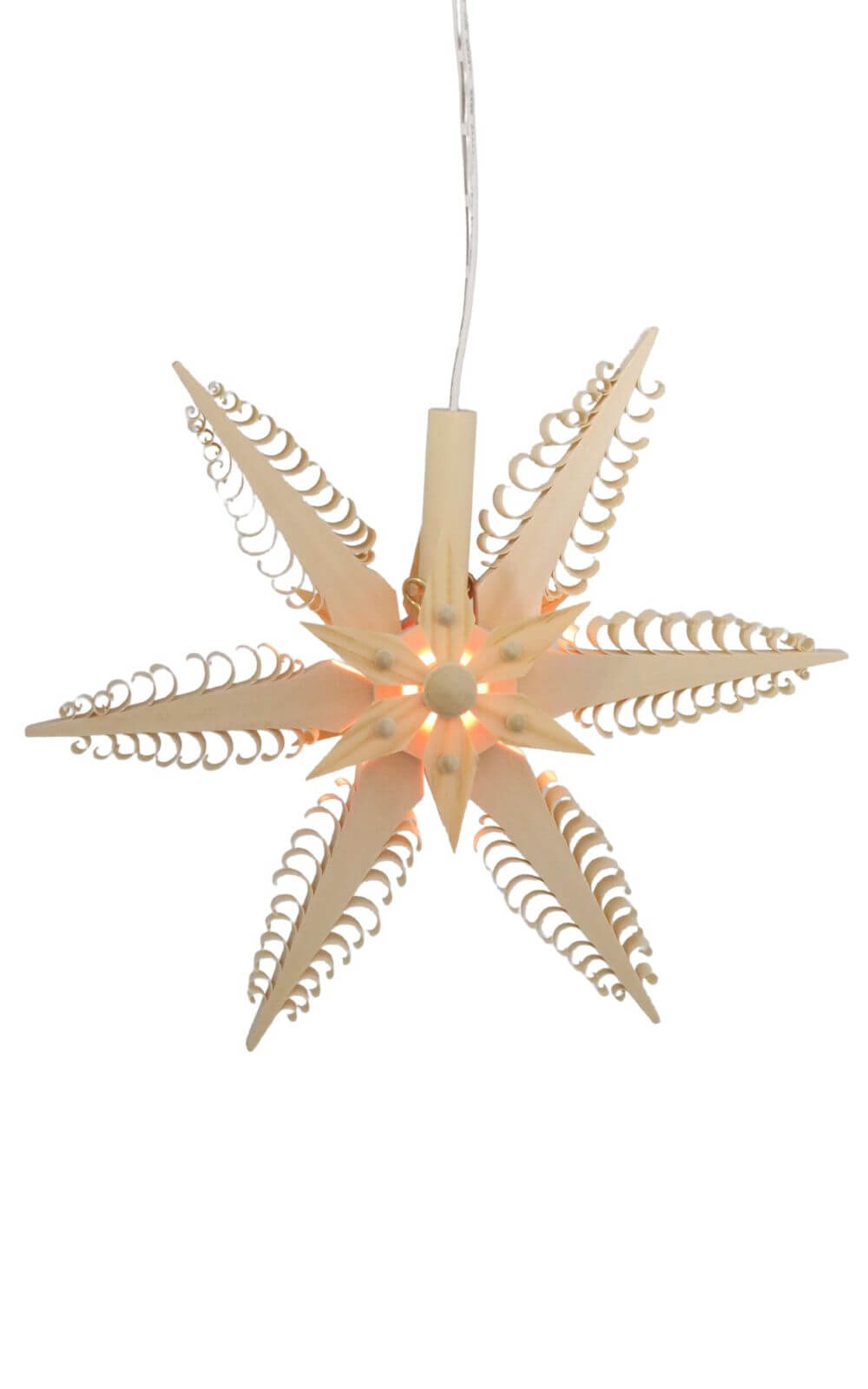 The wooden star is not only a visual highlight, but also functionally illuminated. A glass base lamp (12 V,2 W) provides soft and warm lighting, which brings a festive atmosphere into every room. The voltage of 220- 230 V and the 3 meter long connection cable with switch allow a flexible and easy installation of the star.